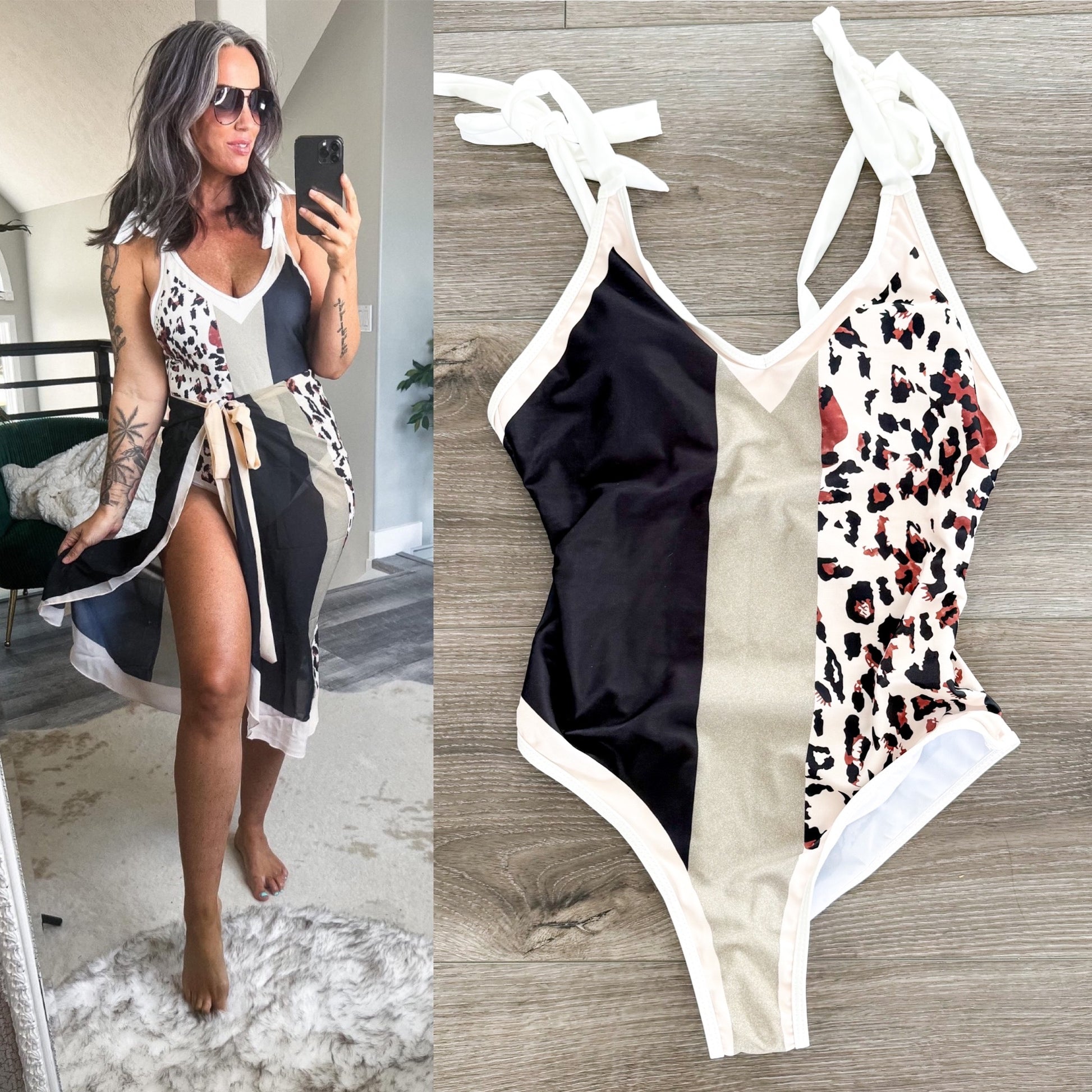 A color block leopard print one piece swimsuit with adjustable tie straps and a v neckline. The skirt is NOT included/available.