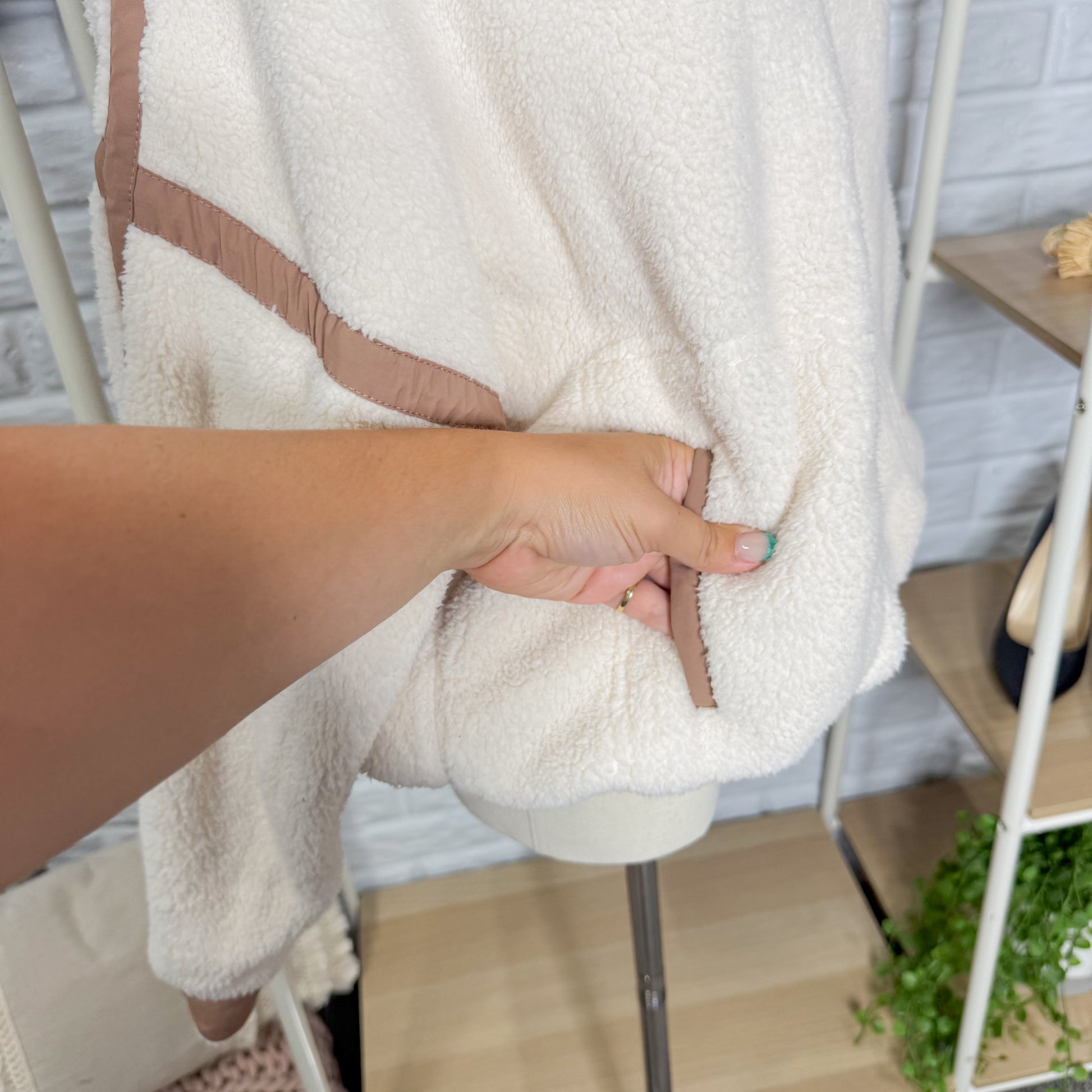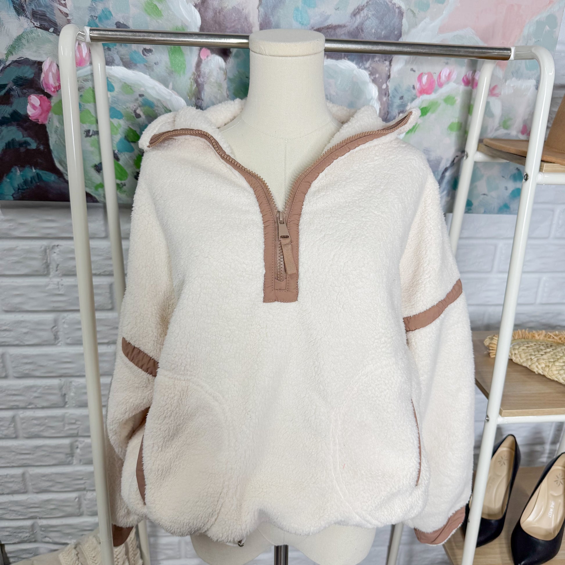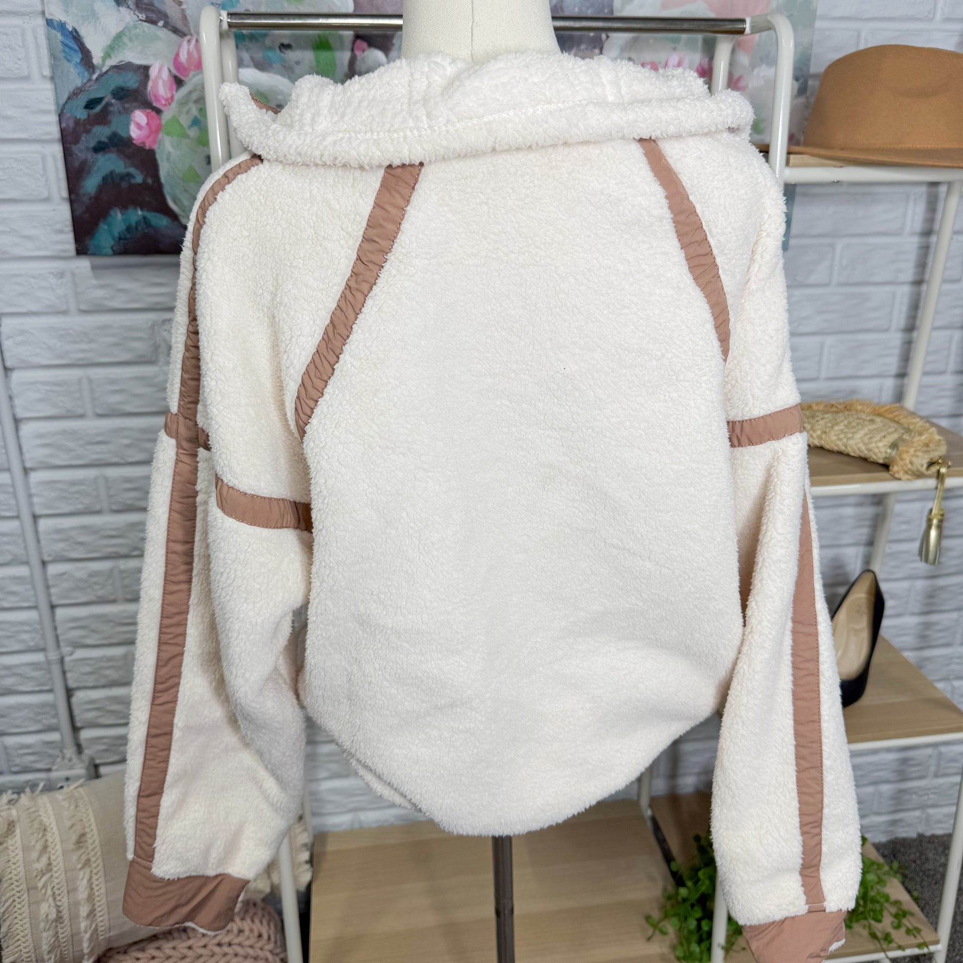 A beige Sherpa pullover with brown trim, half zip neckline and drawstring hem.