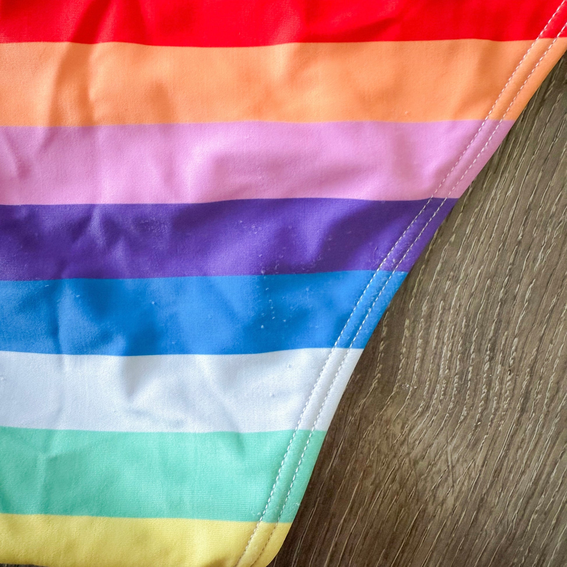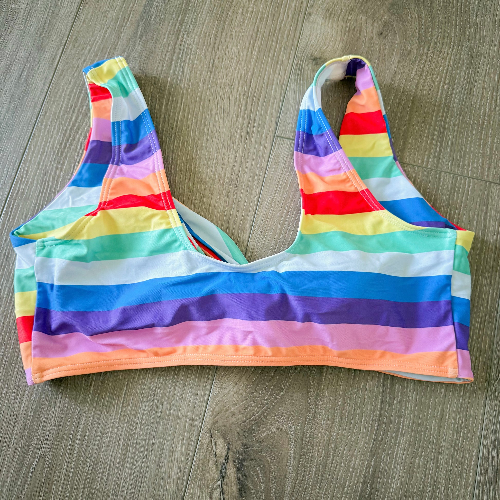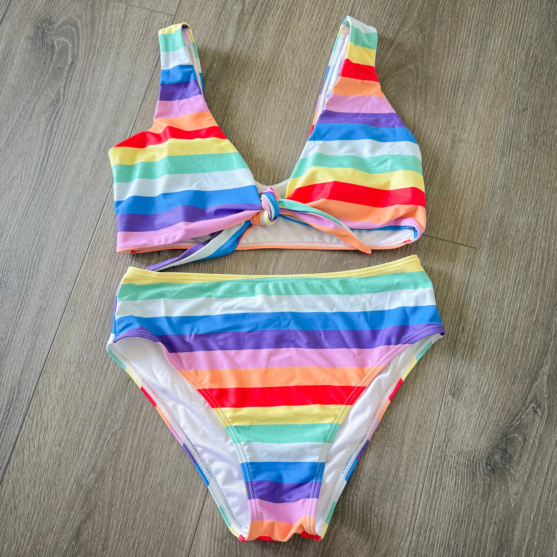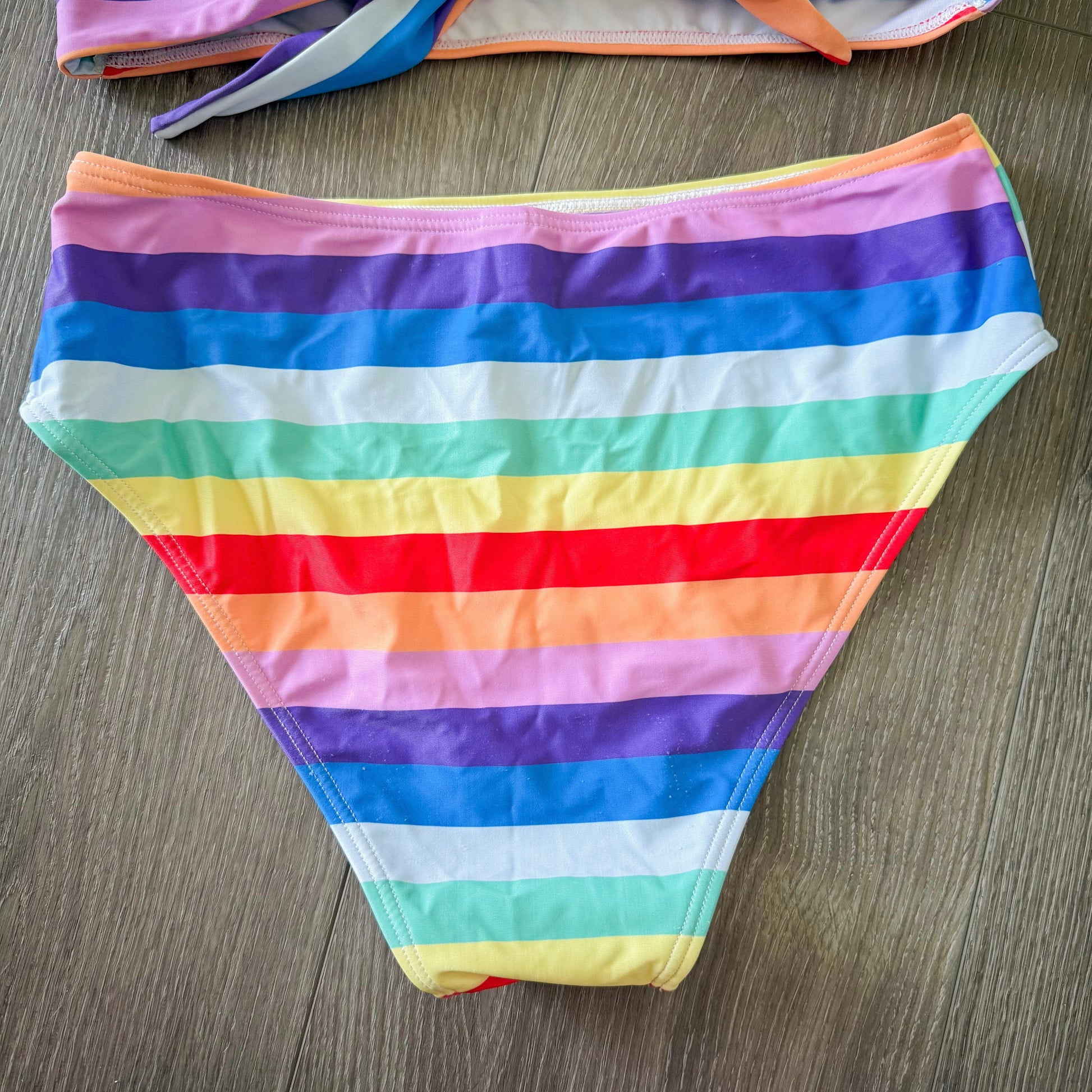 A matching rainbow bikini with high rise bottoms and a adjustable front tie top.