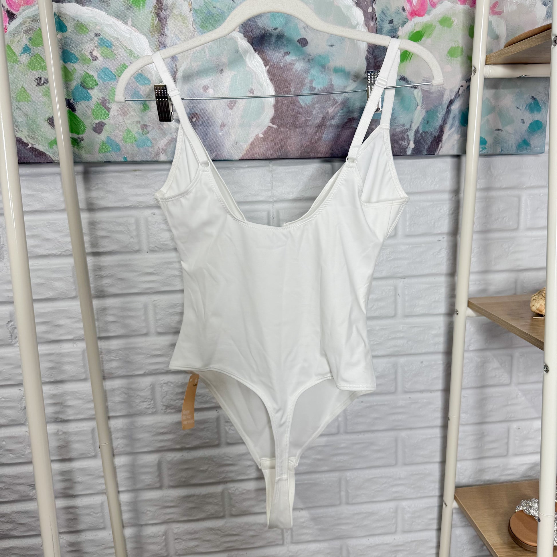 A white shape wear bodysuit with a thong bottom, deep v neckline, and adjustable straps. This is for the WHITE one ONLY. Modeled photo is to show the fit.