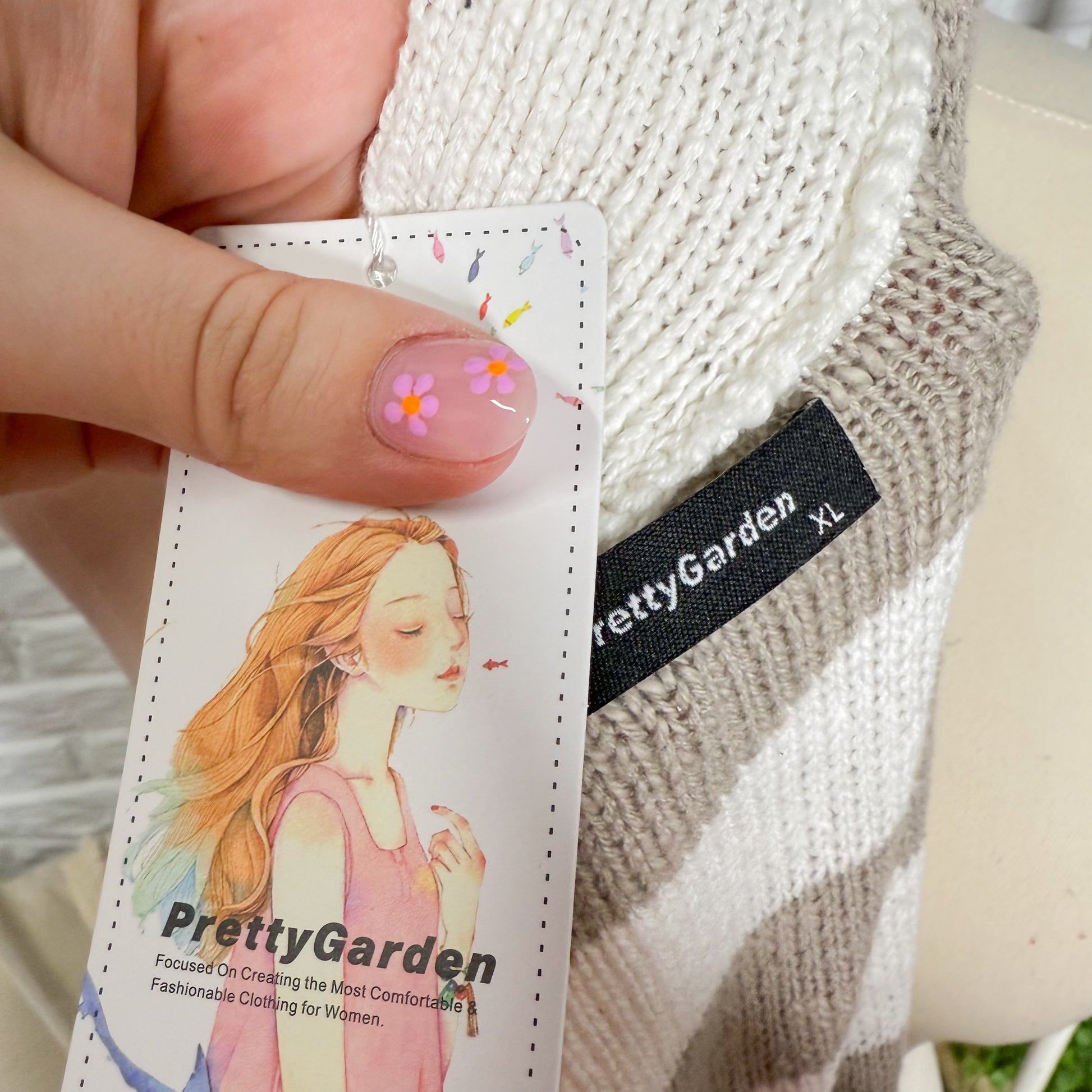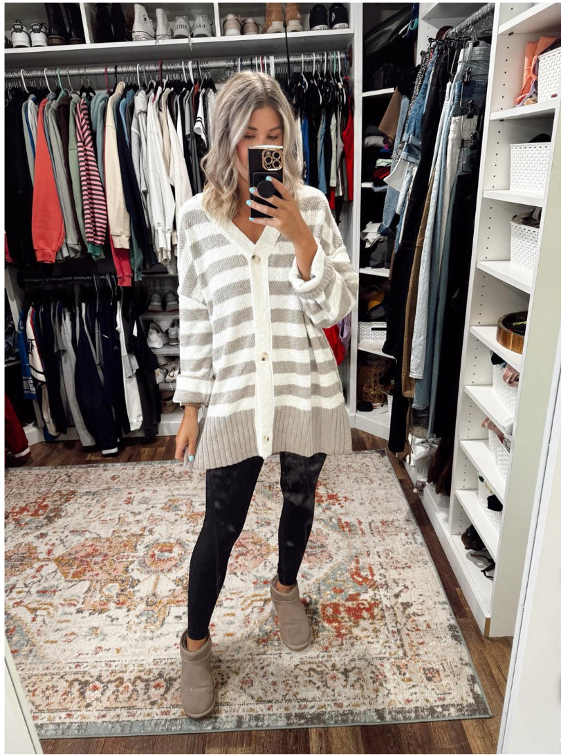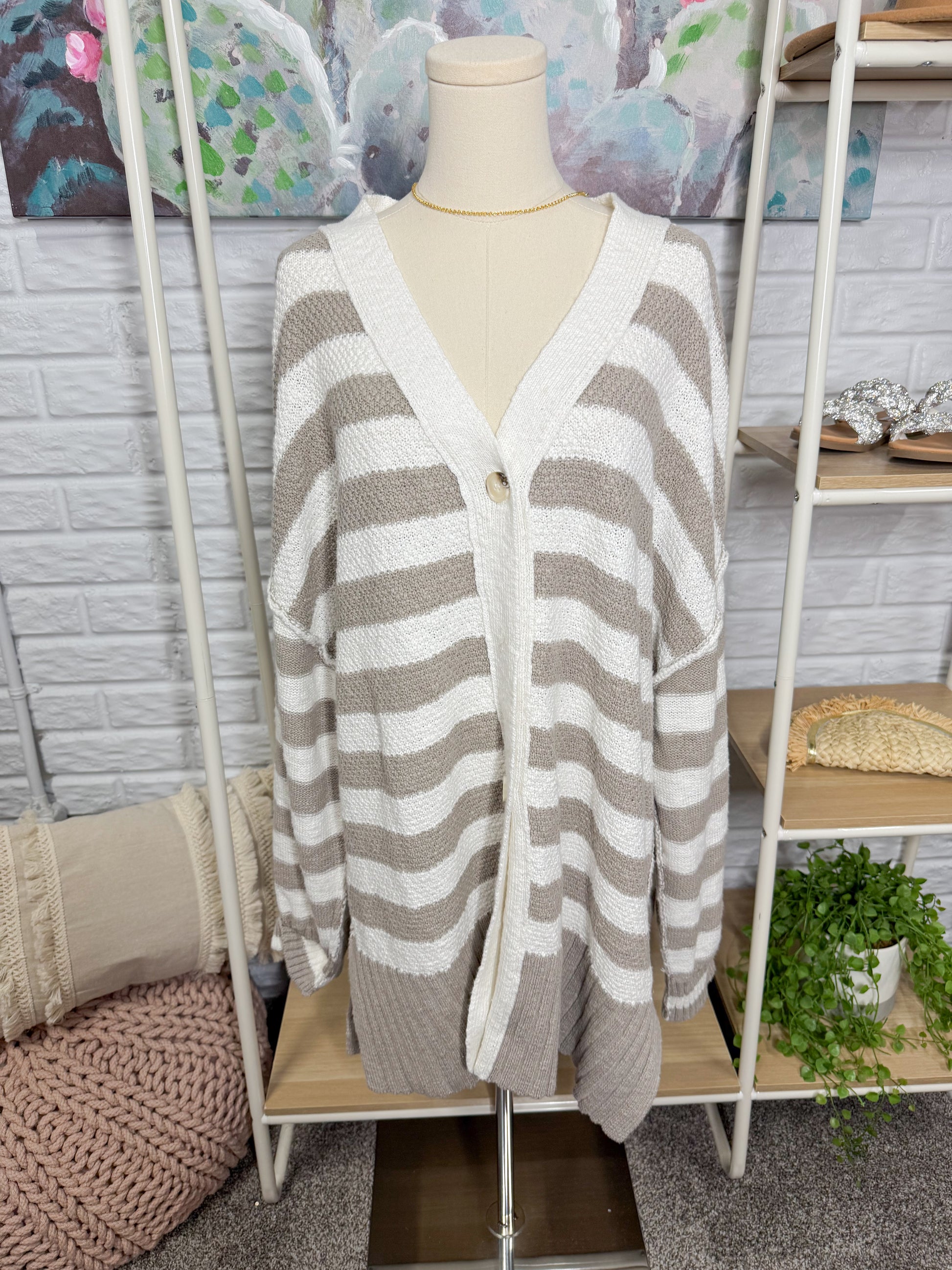 A taupe and ivory striped sweater with a button front and chunky knit material.