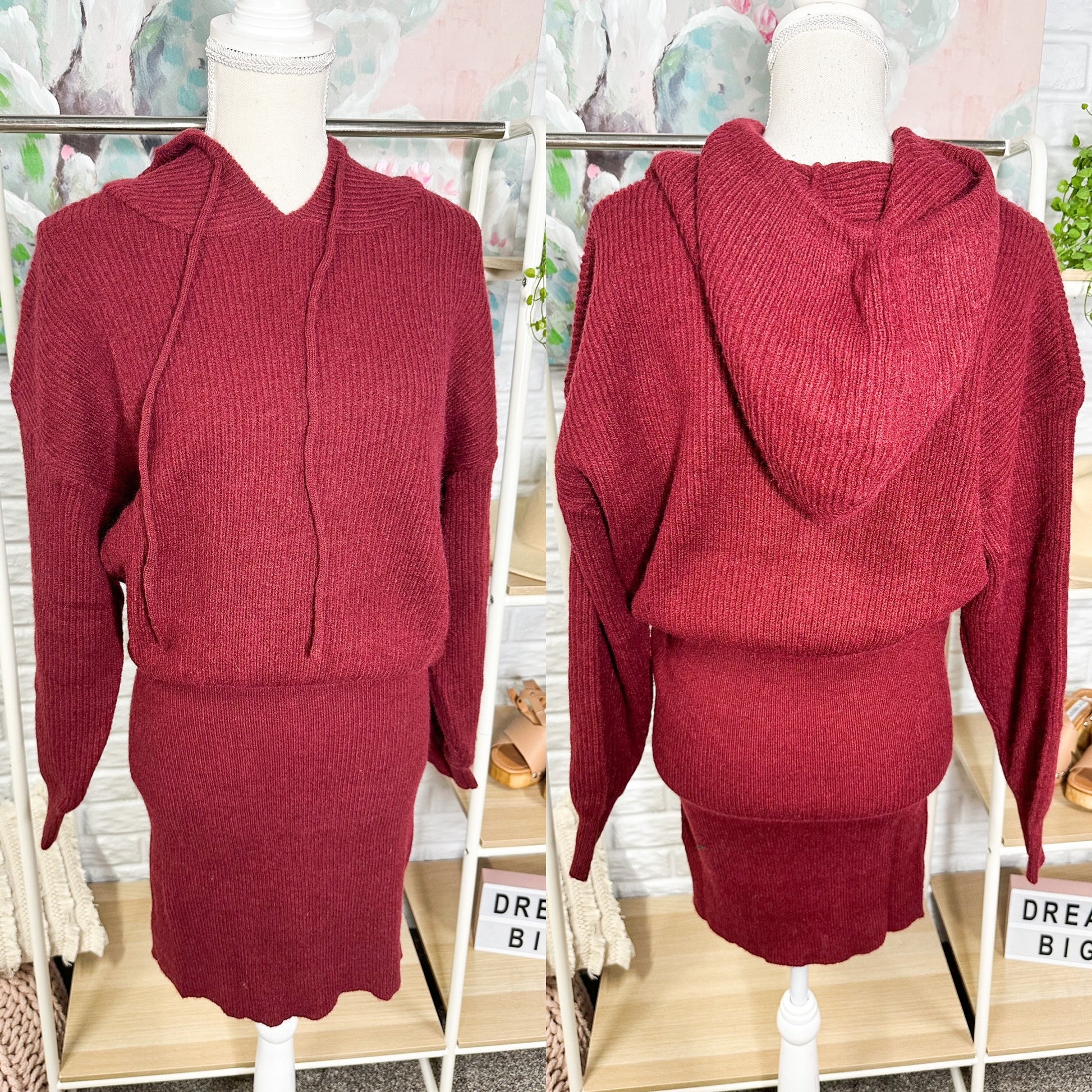 A sweater dress with ribbed stretchy material, long sleeves, and a hoodie.