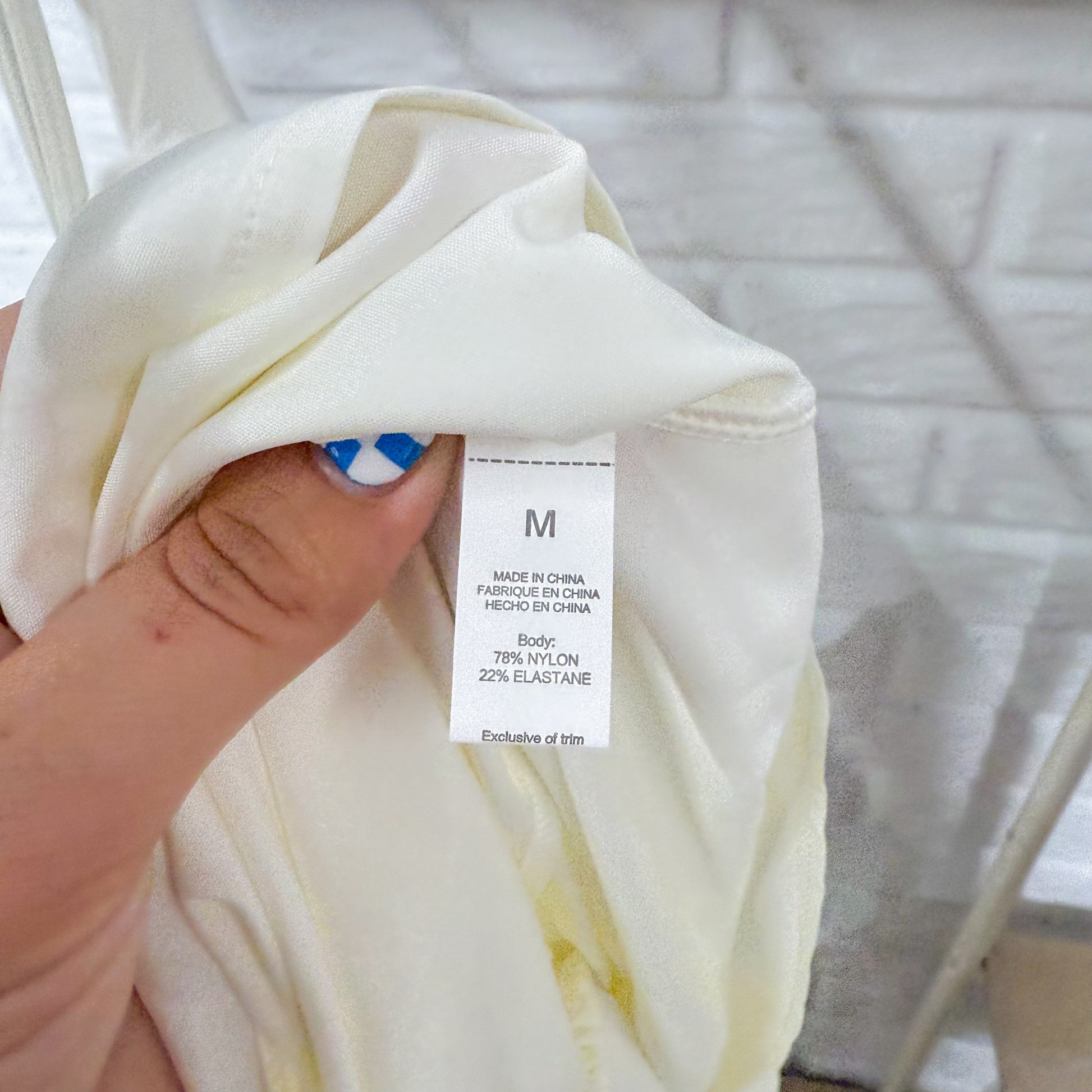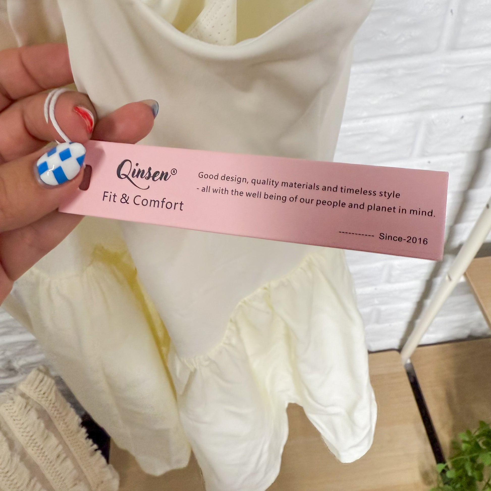 An ivory romper with a square neckline, cross cross back straps, and flowy short bottom.