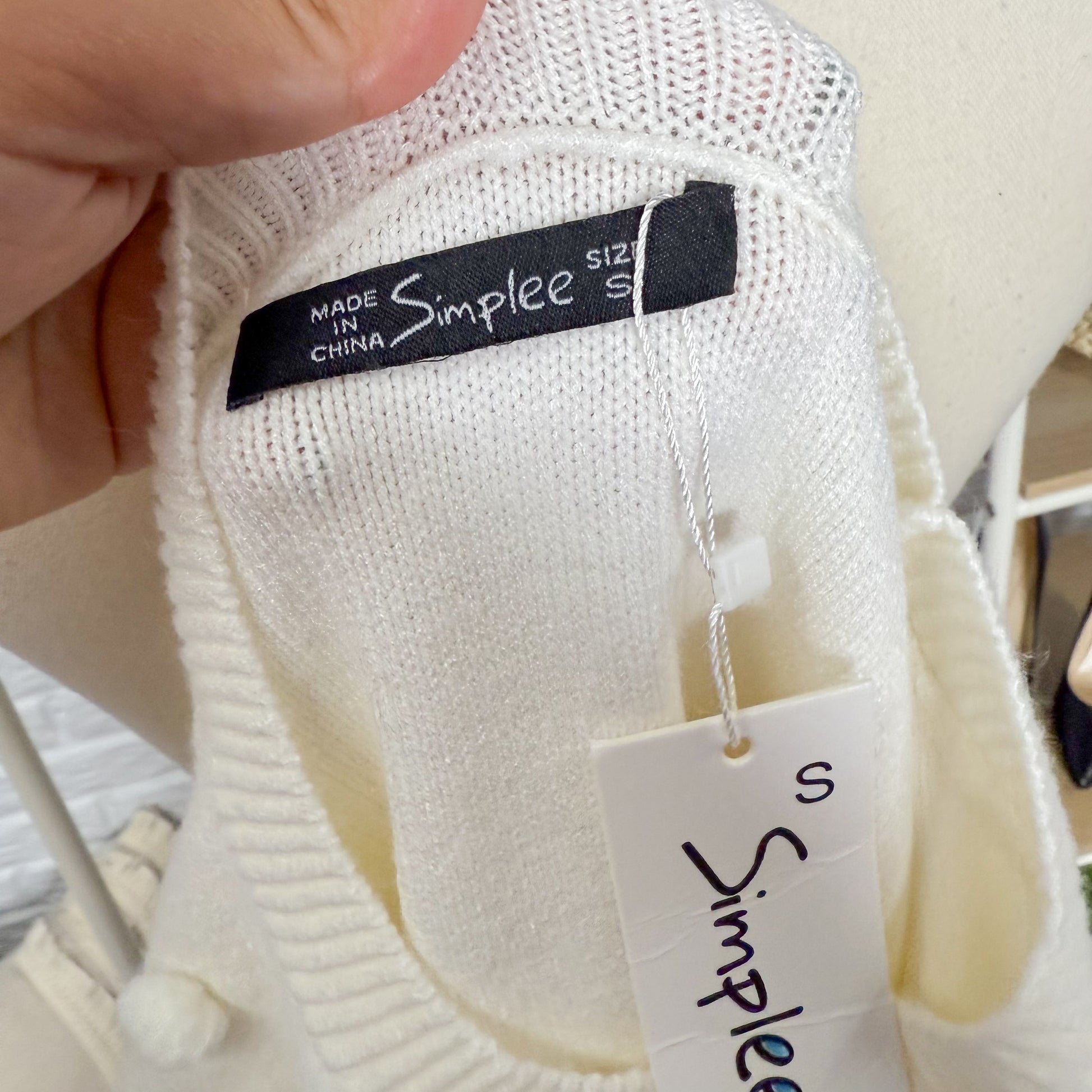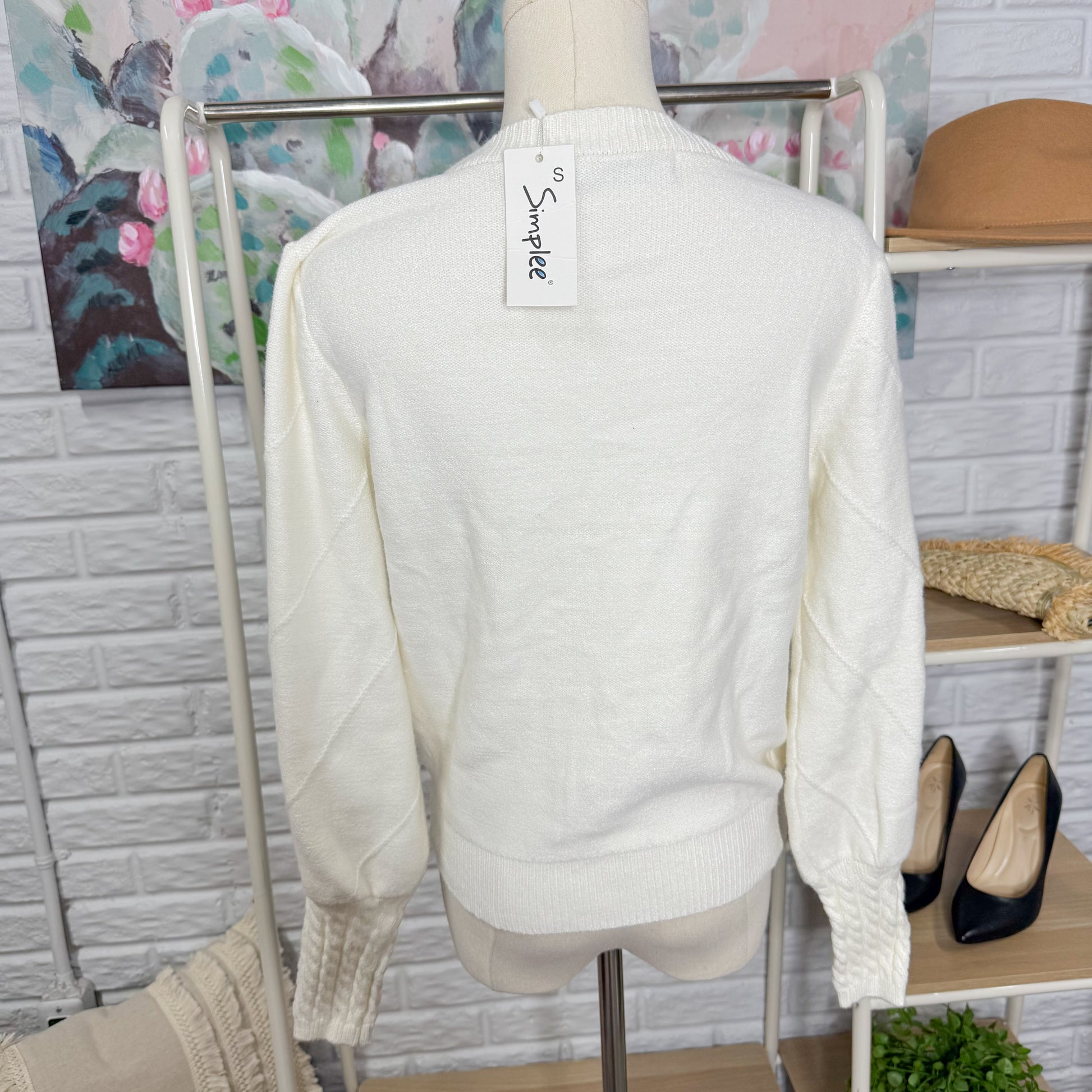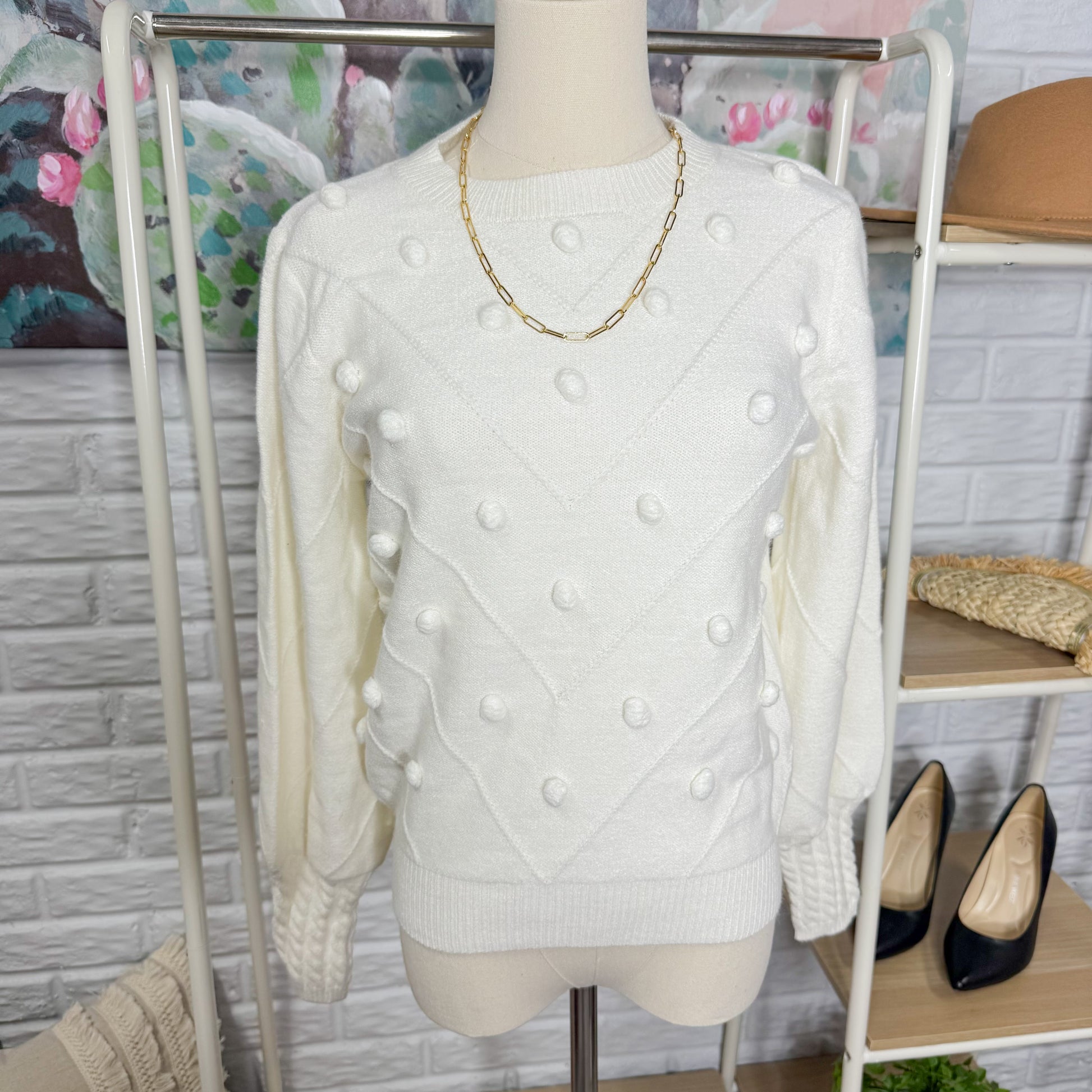 An ivory knit sweater with balloon sleeves and a Pom Pom chevron design.