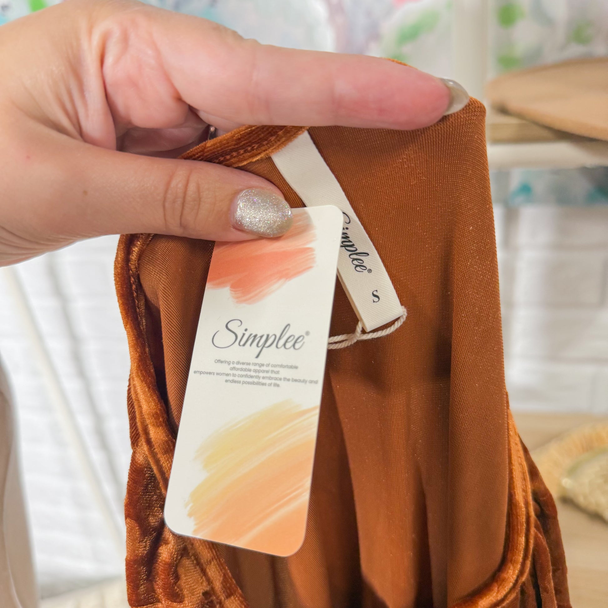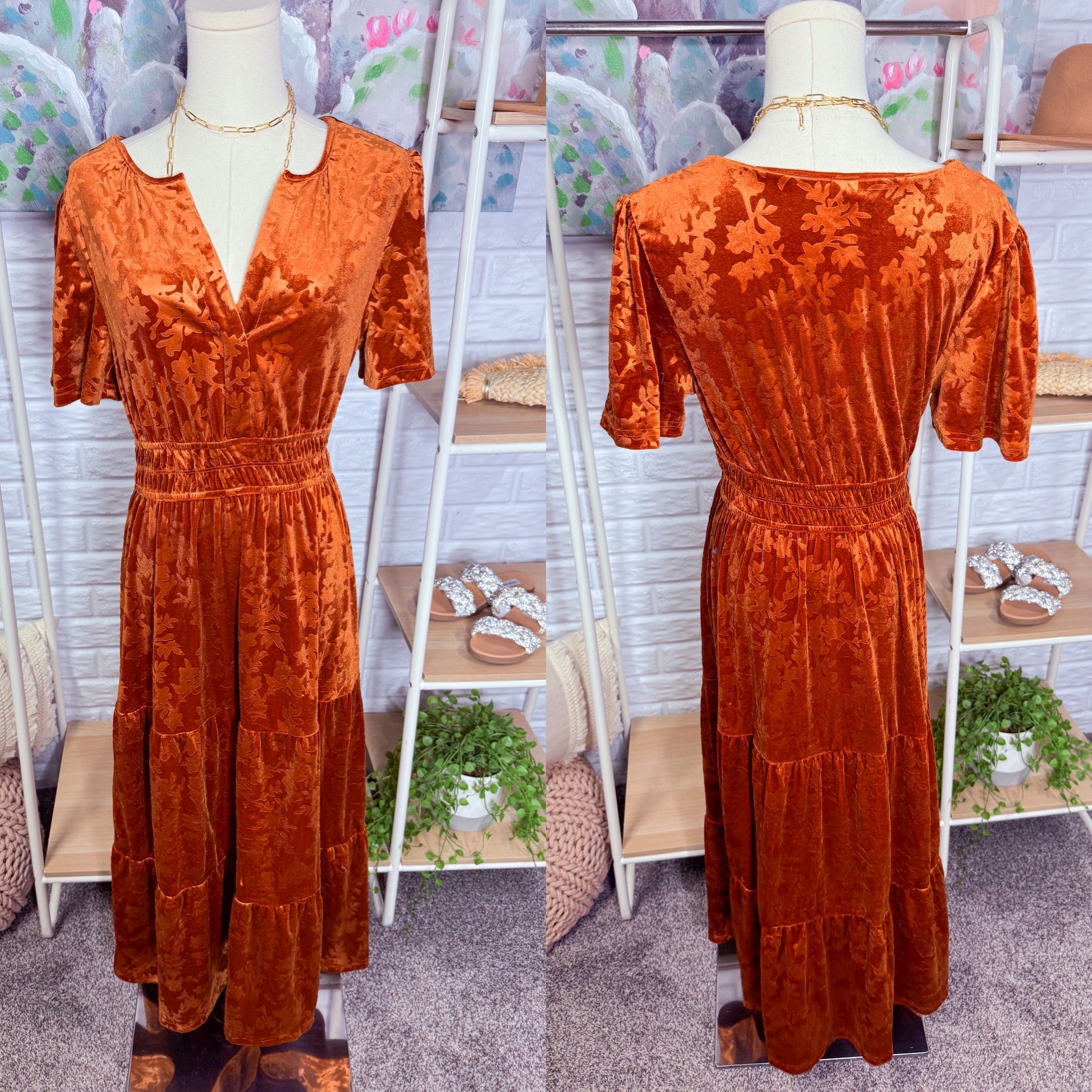 a orange velvet dress with a v neckline, elastic waistbands, tiered skirt and a leaf pattern.