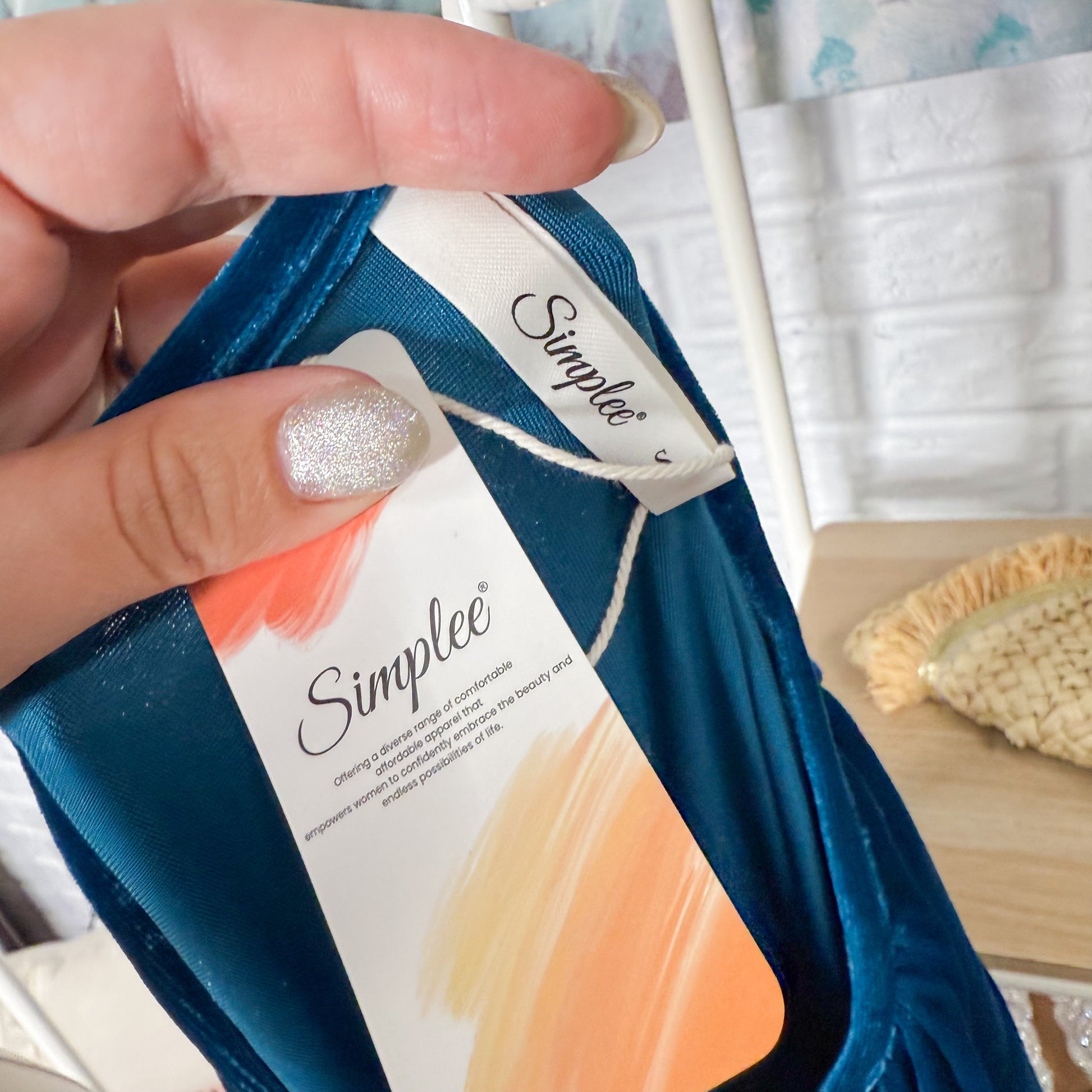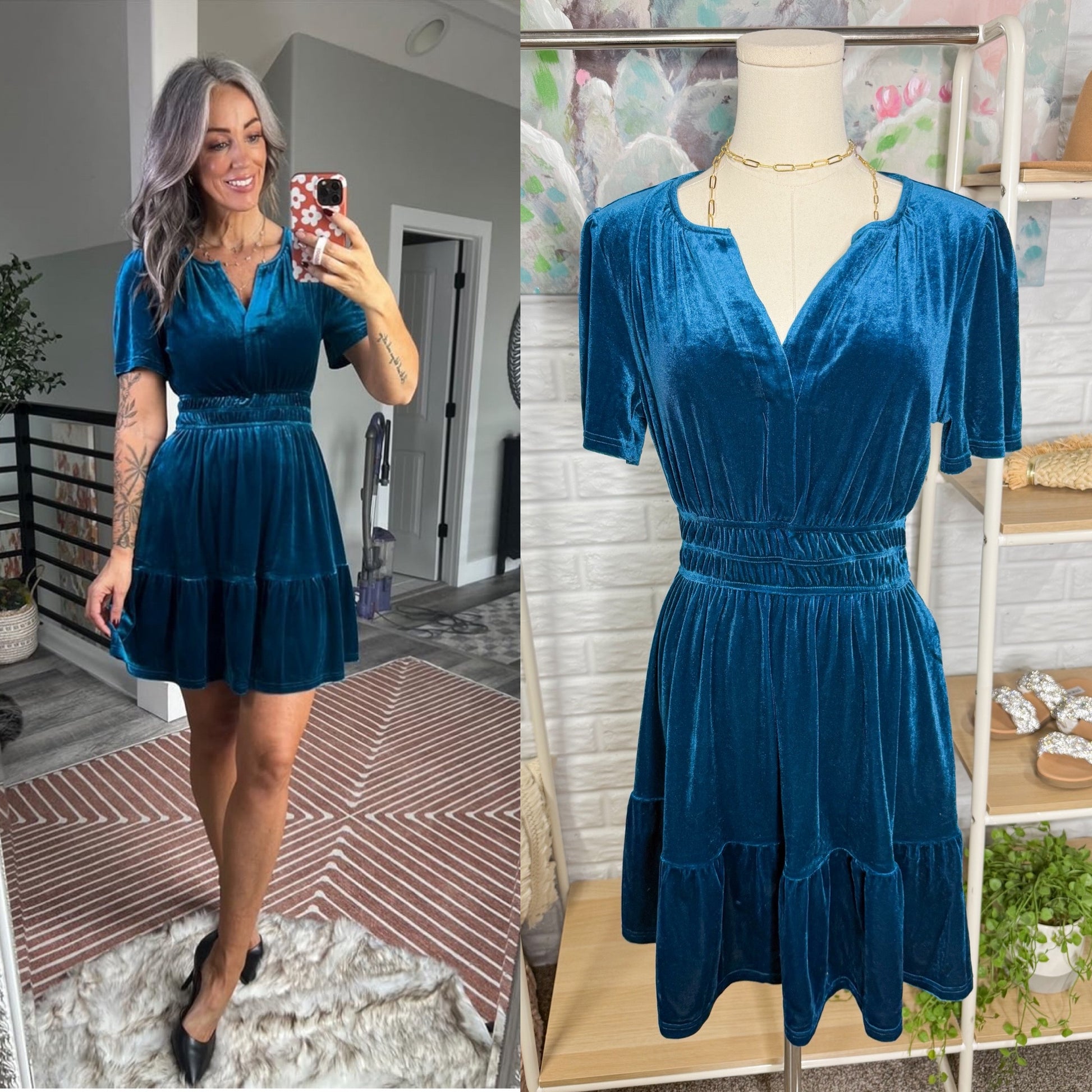 A mini cocktail dress with a velvet blue fabric with a v cut neckline and three elastic waist bands.