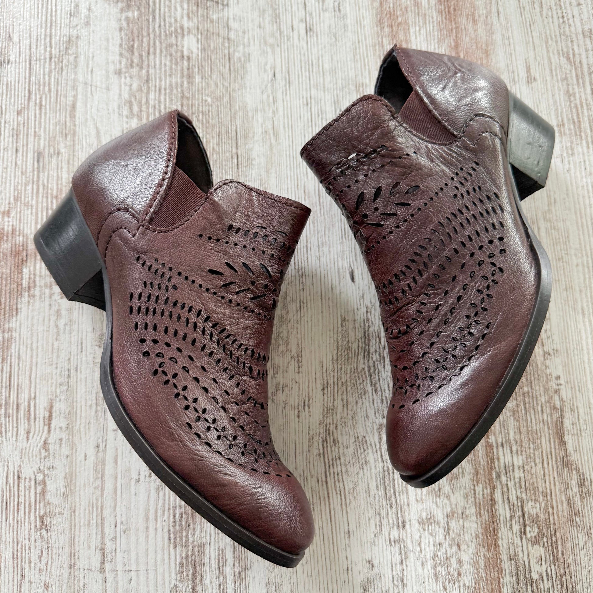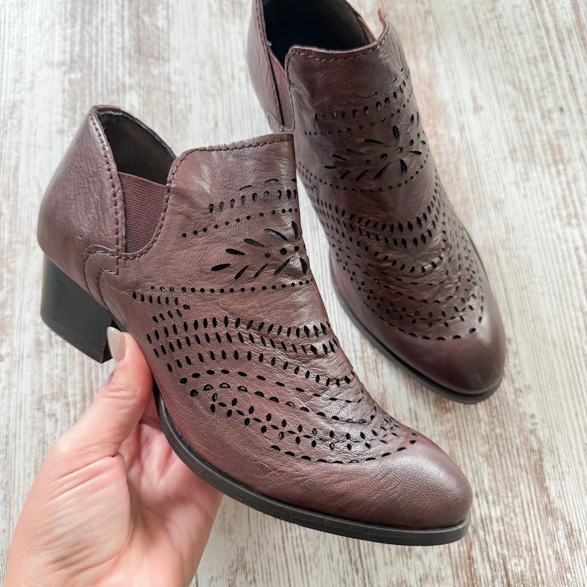 With intricate cutwork at the upper, these pointed-toe leather ankle booties offer artful sophistication in an effortless slip-on style. Twin elastic gores ensure a comfortable fit, while the 1.5" heel and flexible TPR sole provide all-day comfort with every step.