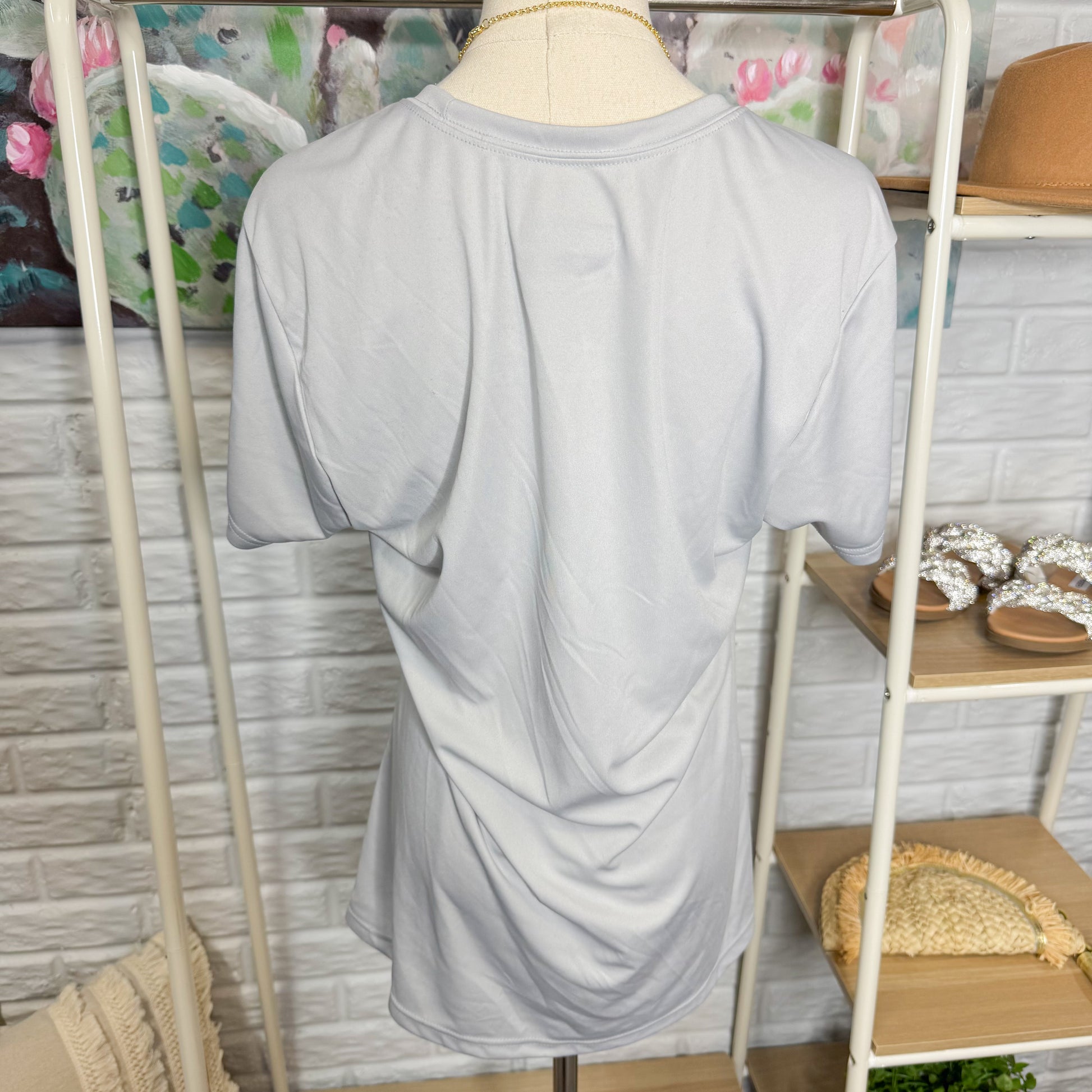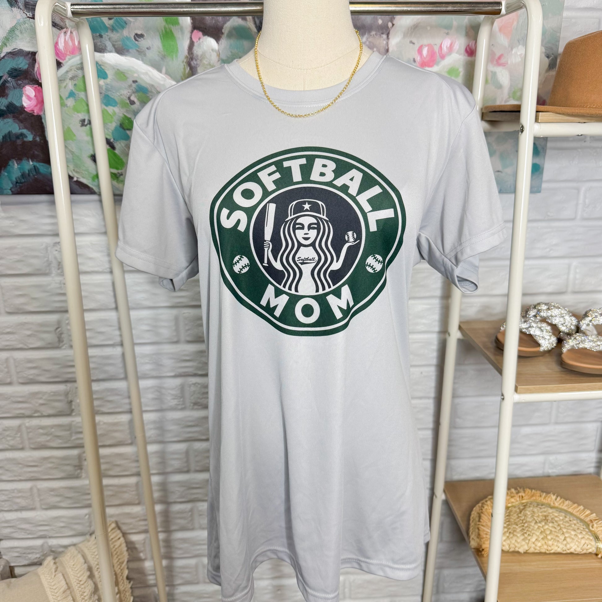 A light gray athletic shirt with a Softball Mom graphic inspired by the Starbucks logo.