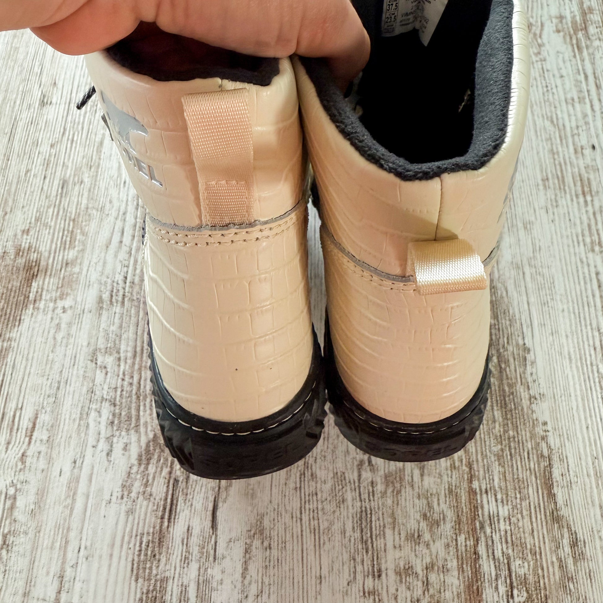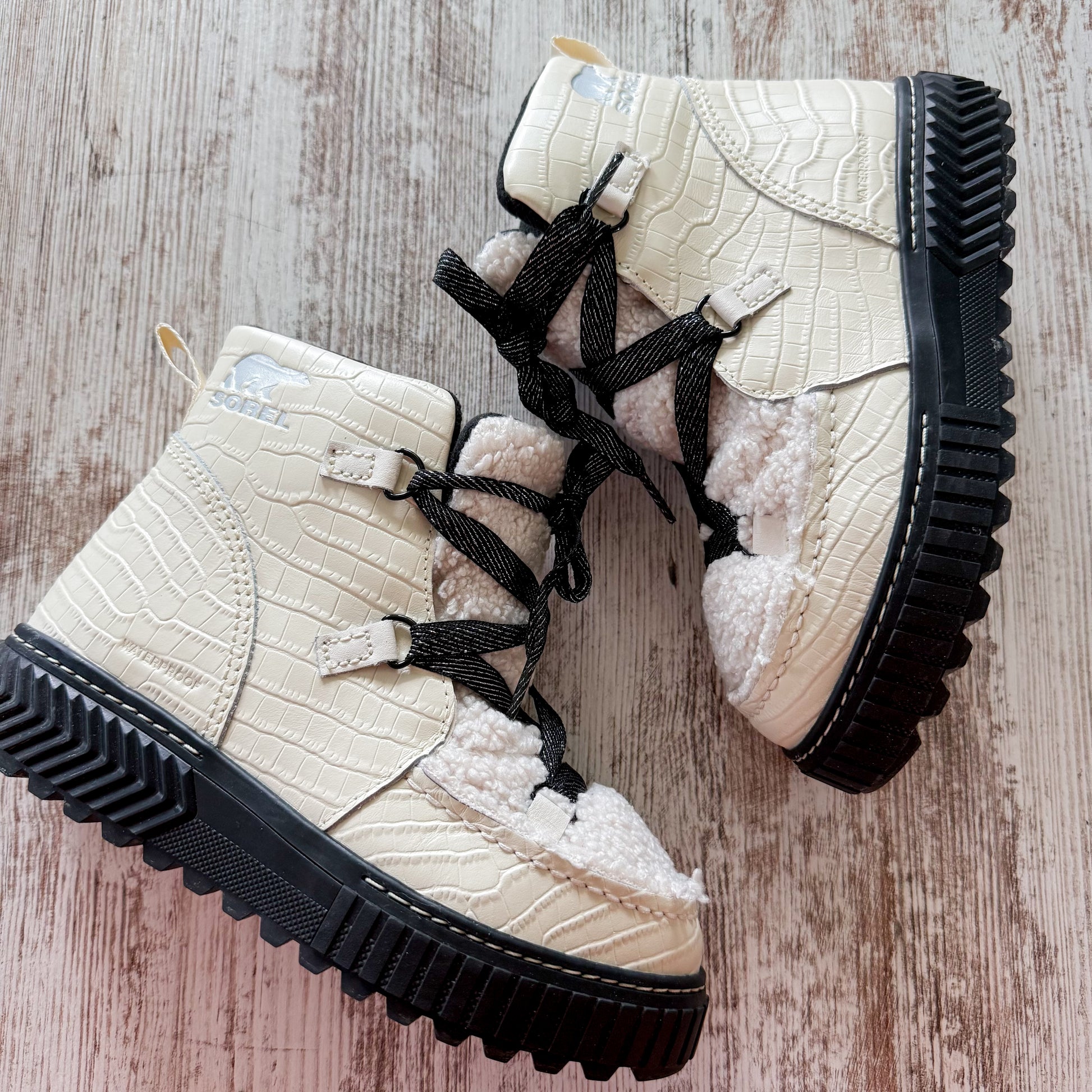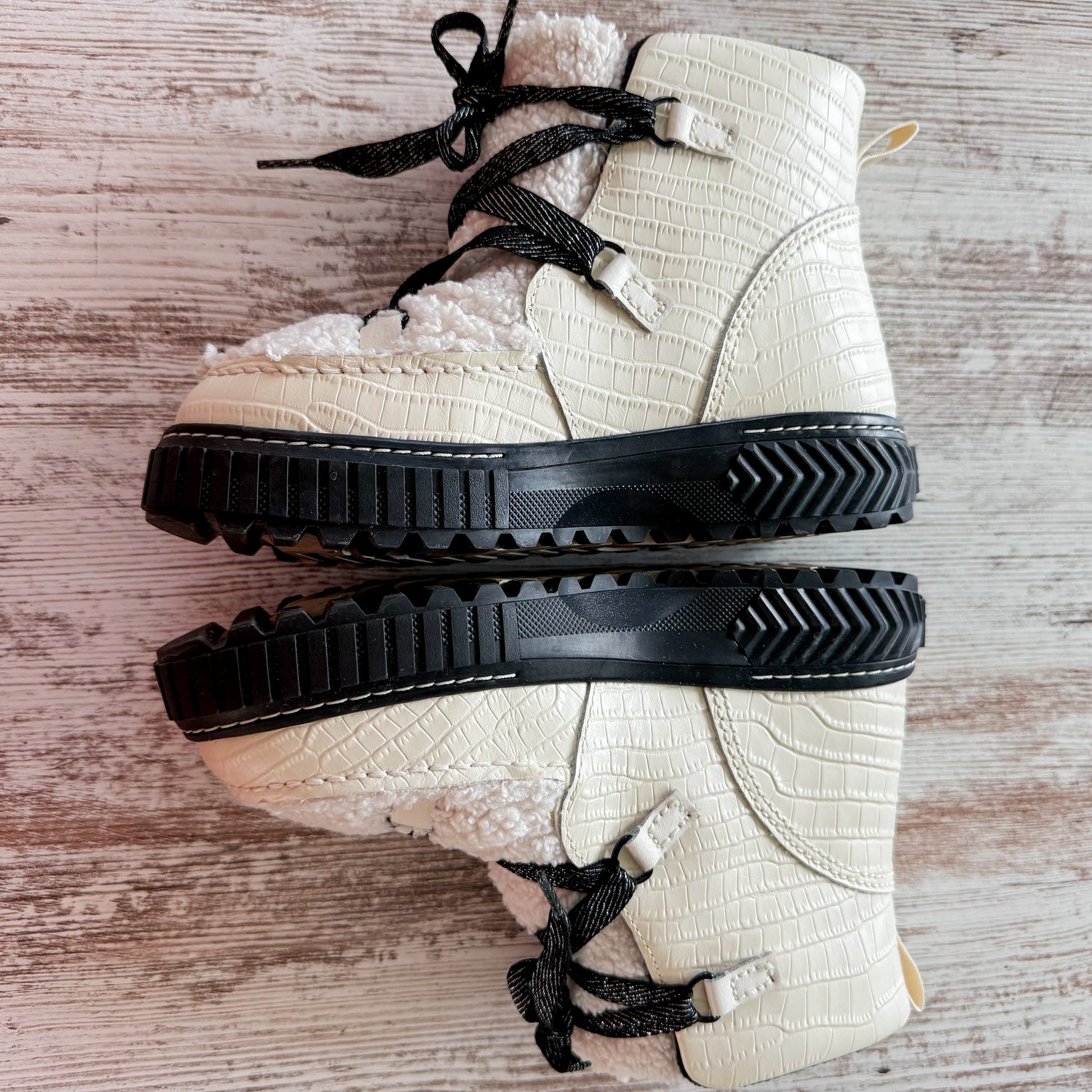 - UPPER: Waterproof croc embossed leather. Faux shearling in tongue and vamp. Heel pull tab. D-ring hardware in eyestay. Fleece lining. Waterproof bootie construction. Laces are not waterproof.