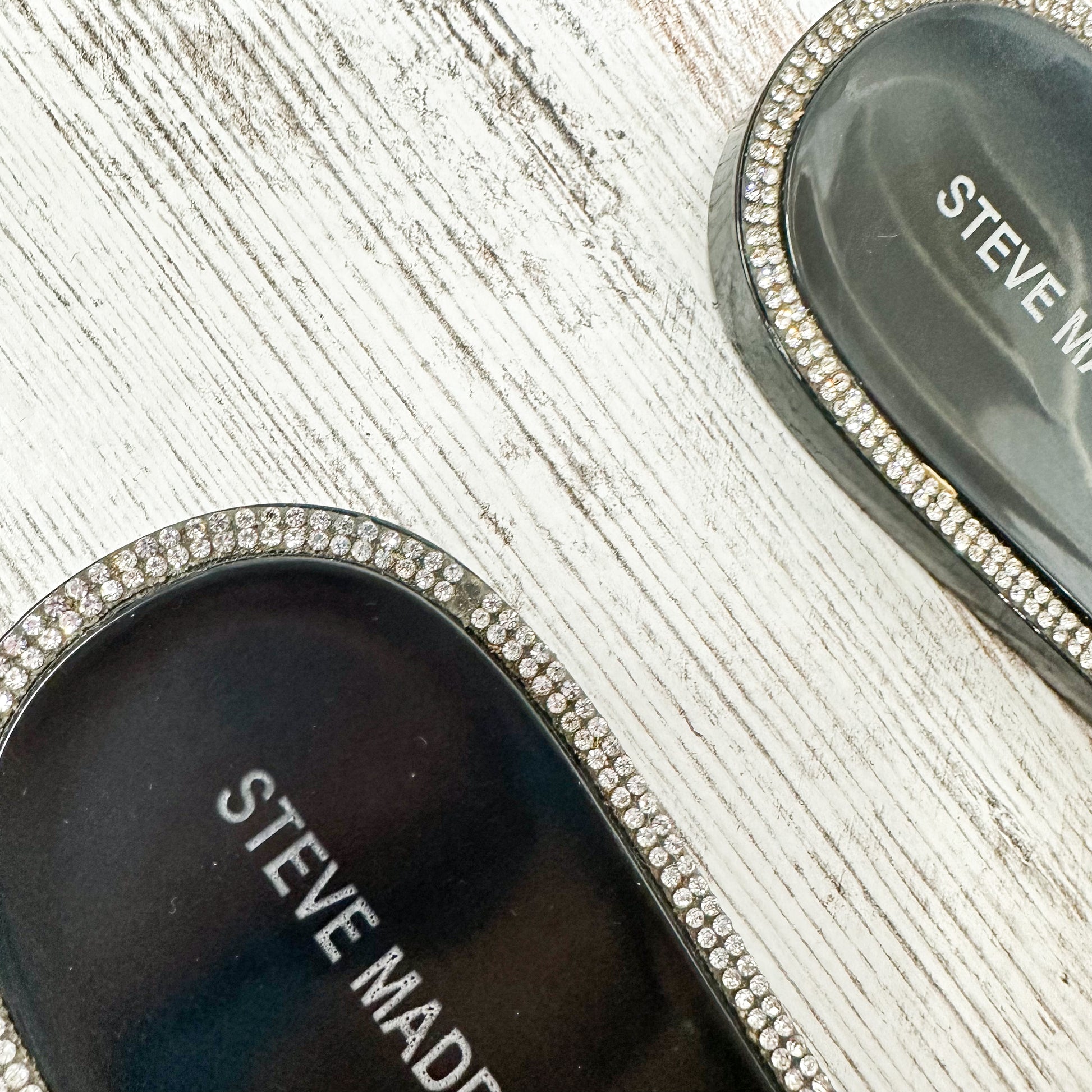Black jelly slices with open toes, thick clear straps covered in silver metal studs, and small rhinestones around the outer edges.