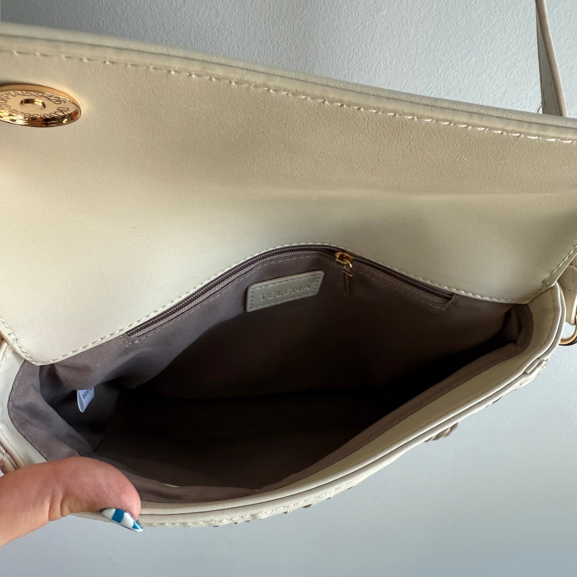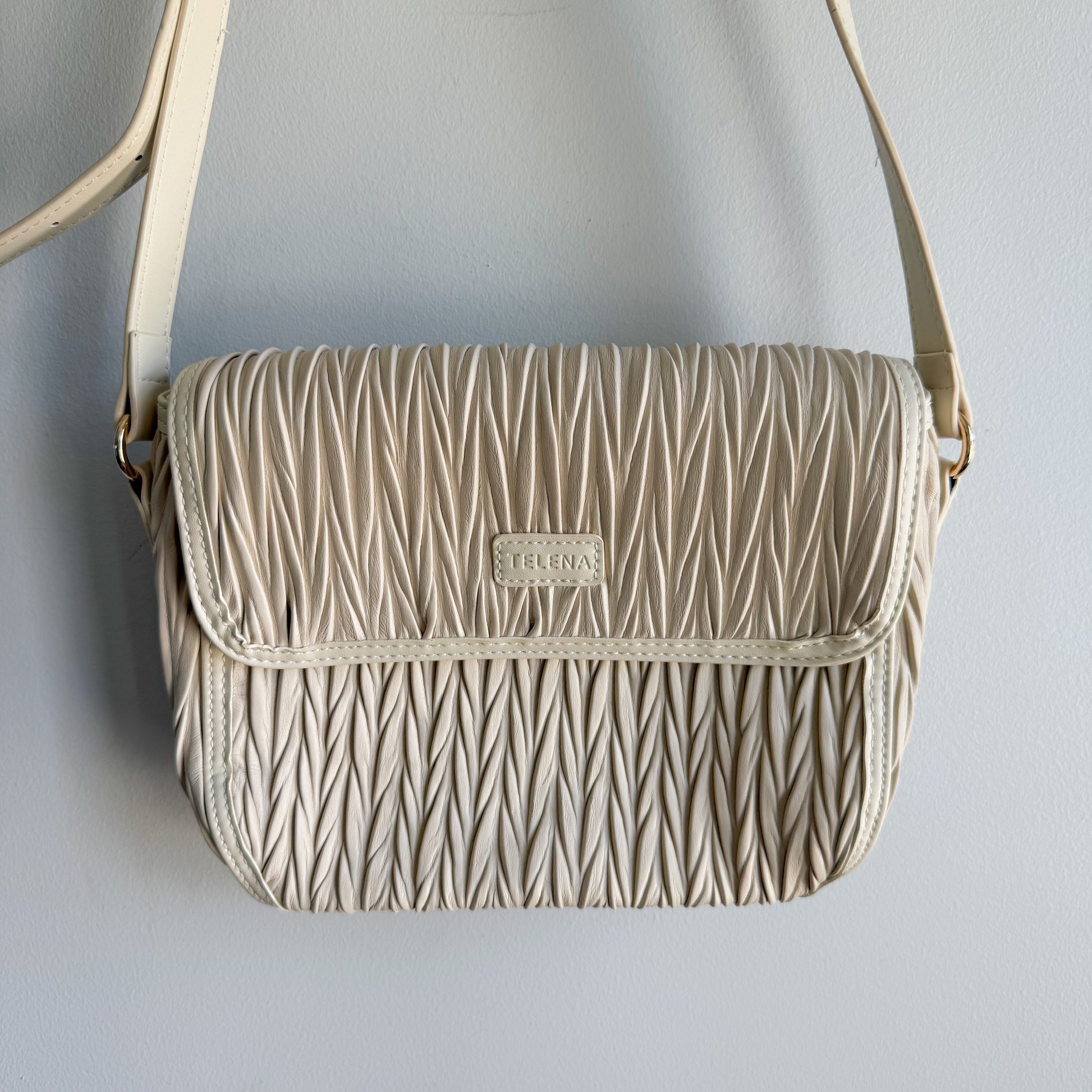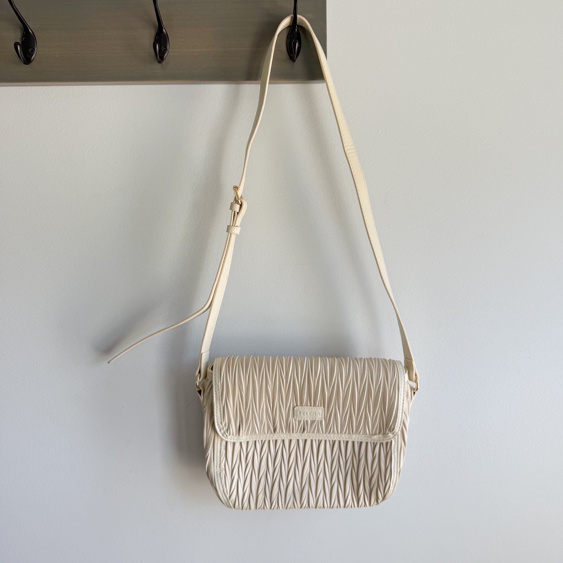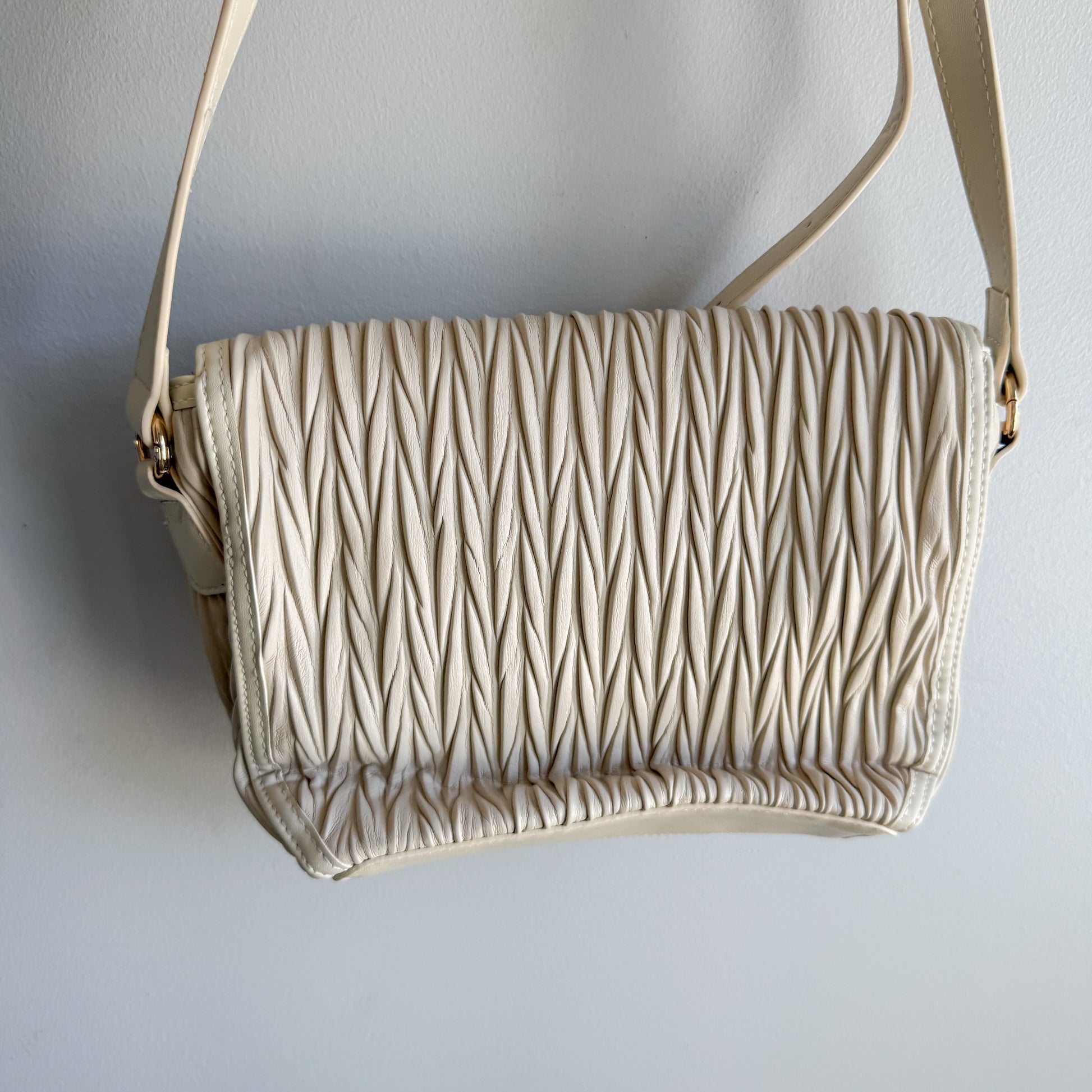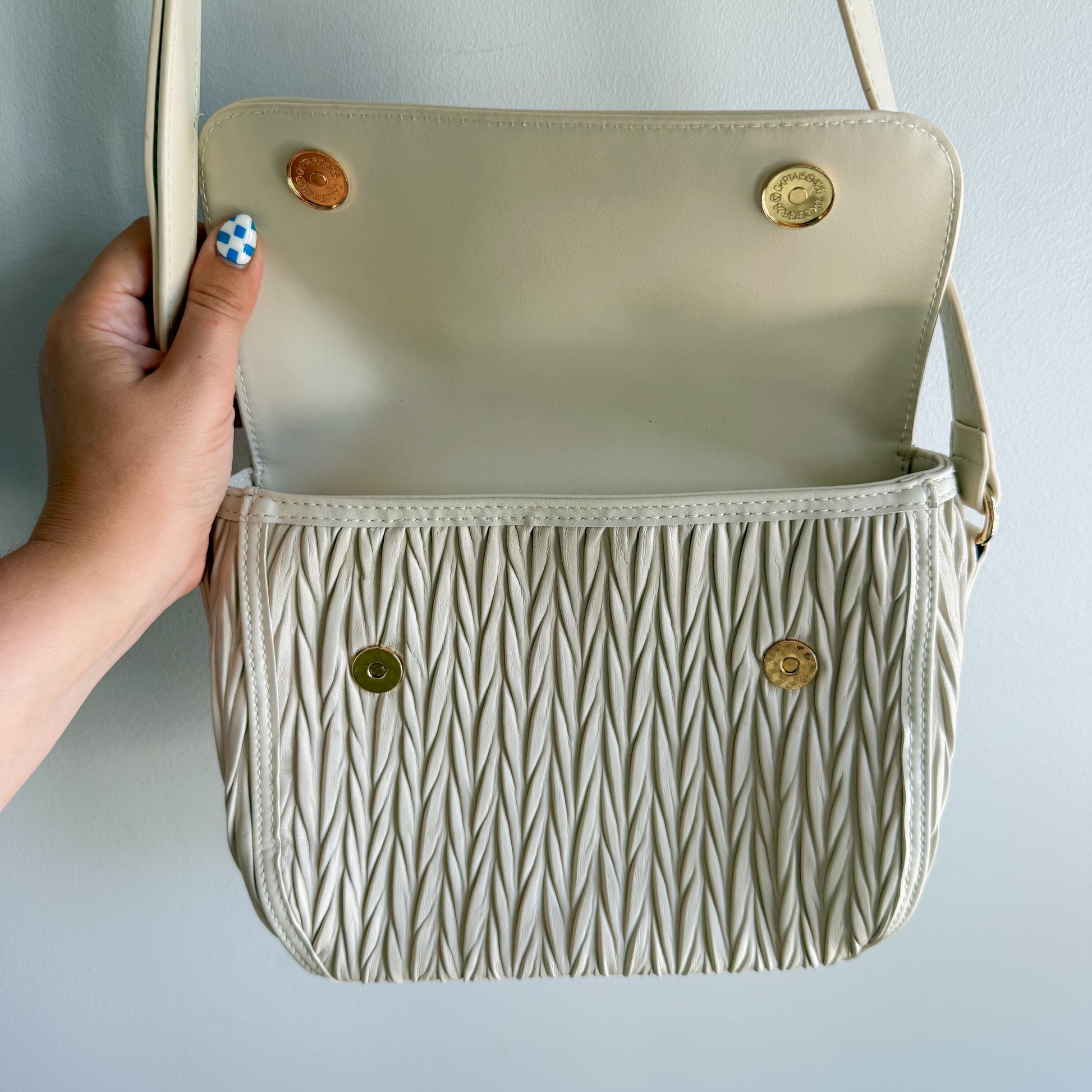 An ivory textured crossbody bag with an adjustable strap and metal snap button closure.