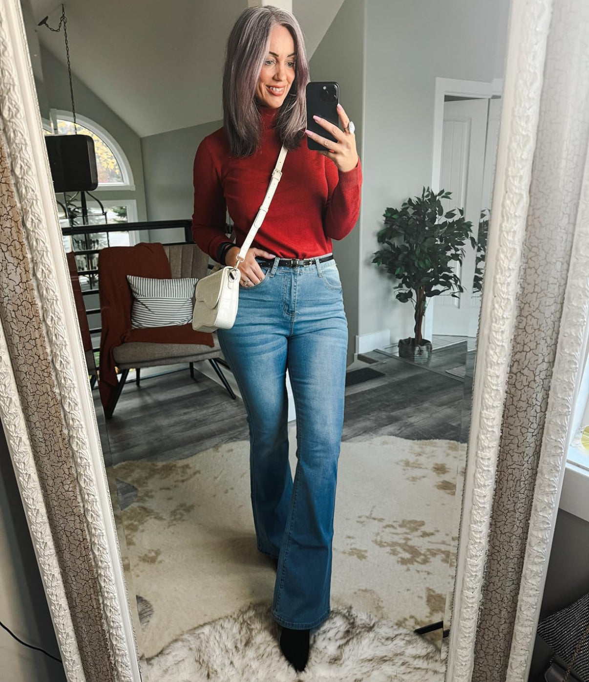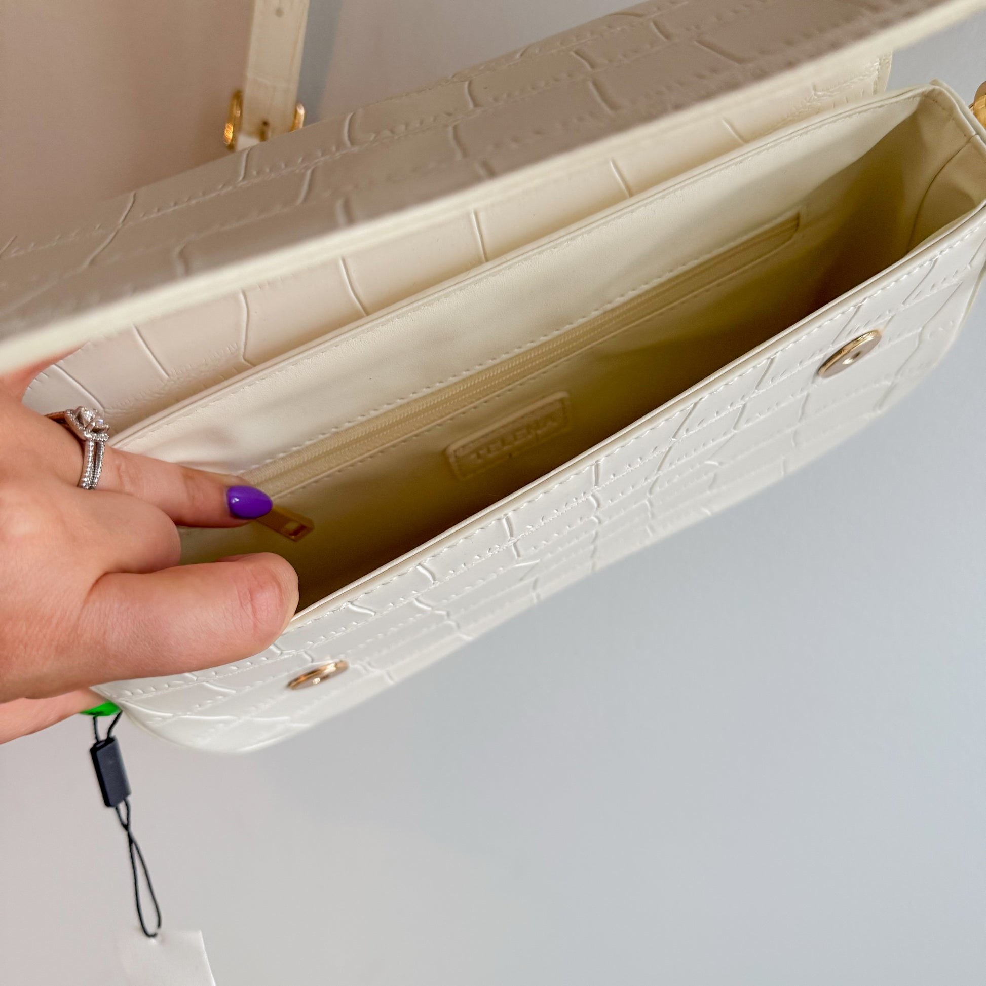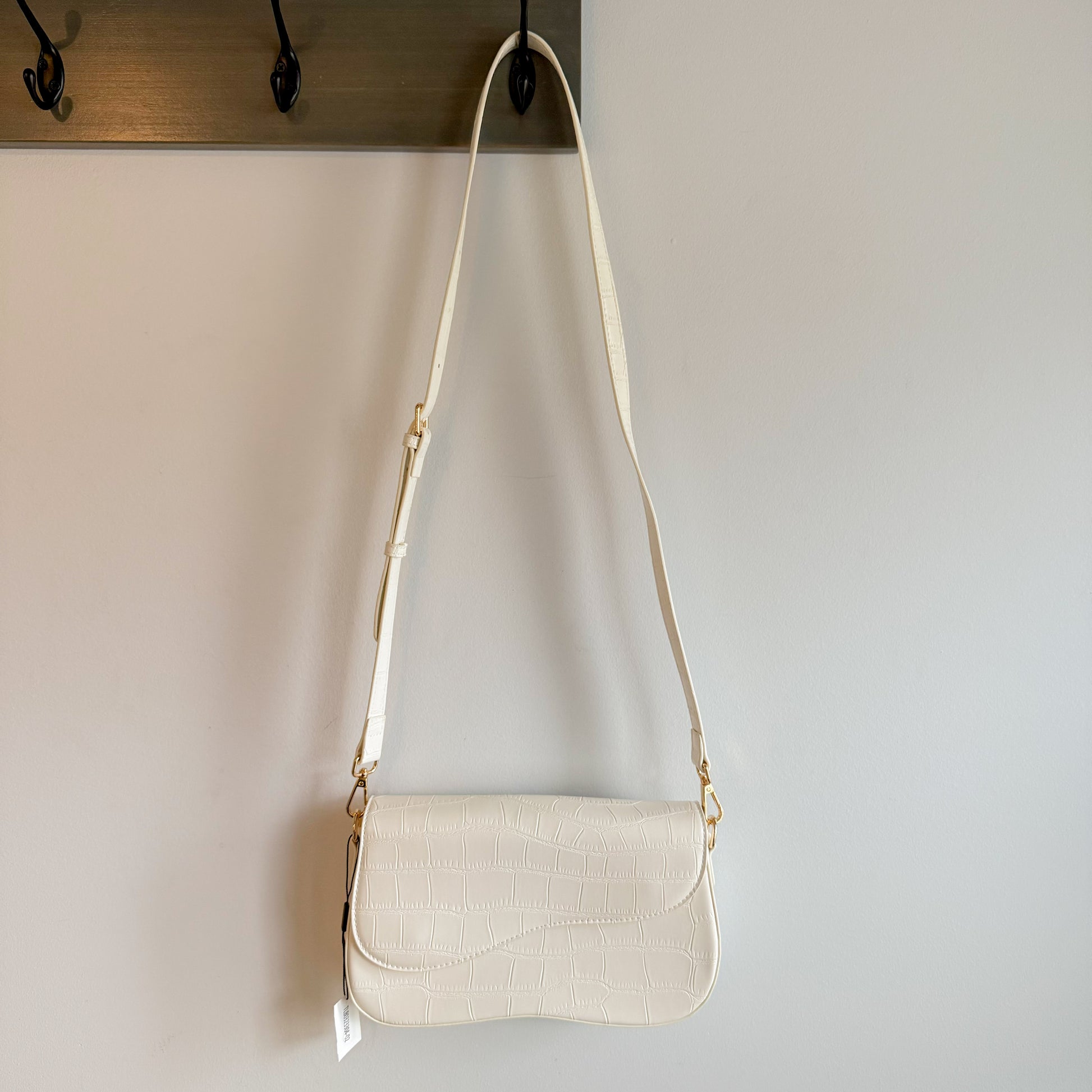 A white crossbody shoulder bag with a metal snap closure and main compartment.