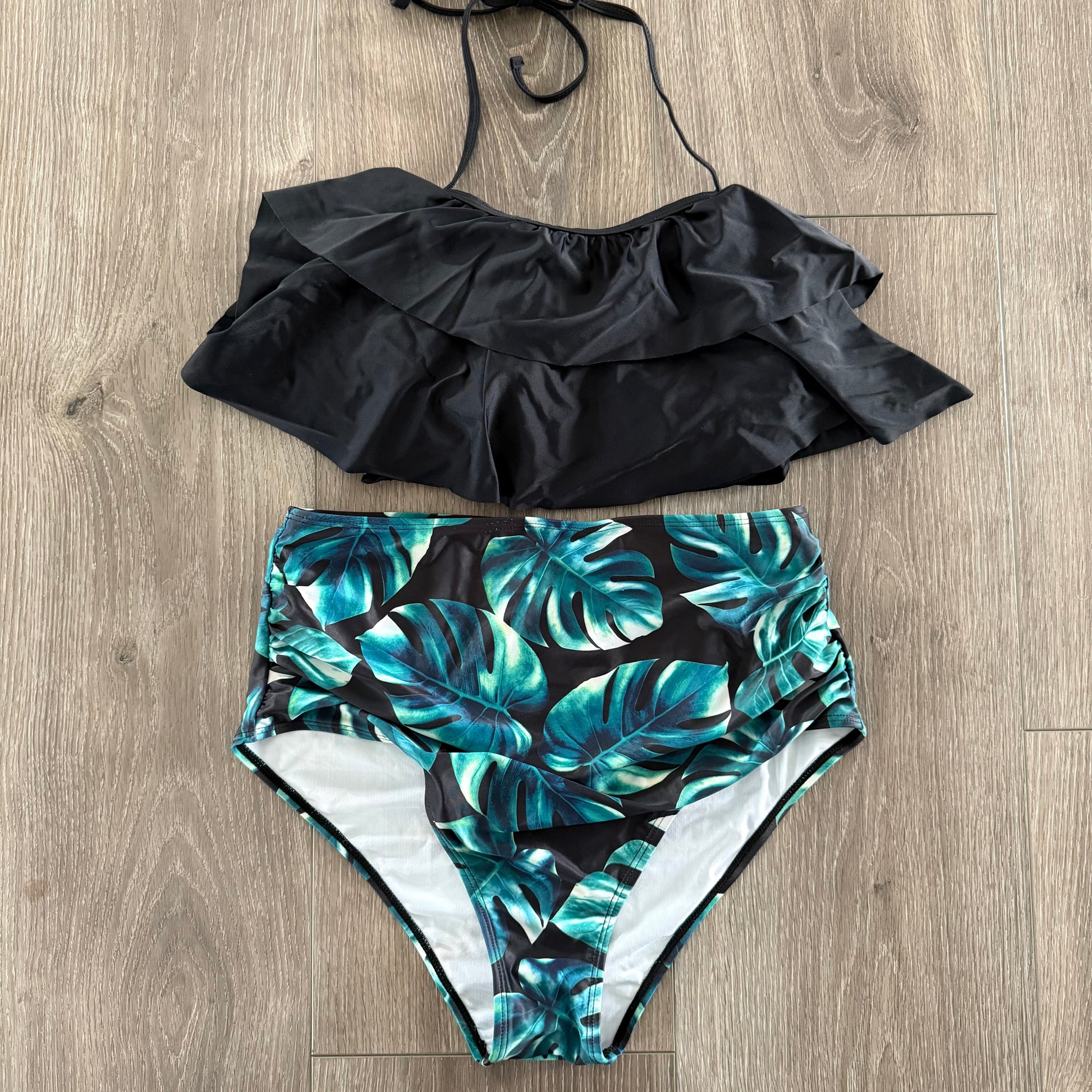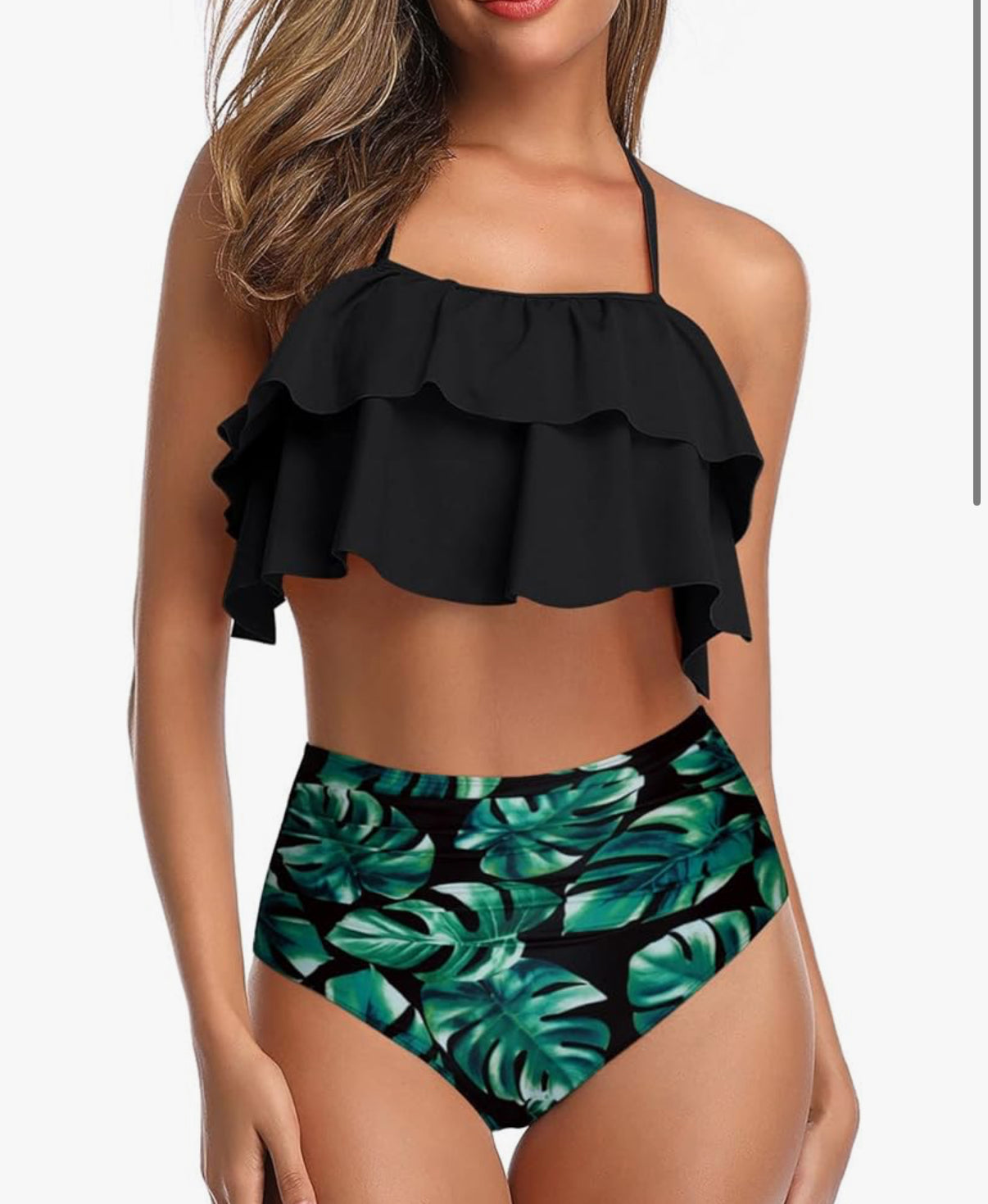 A matching bikini set with a high rise palm leaf tropical bottom and a matching black ruffle layered top with a halter adjustable tie neck.