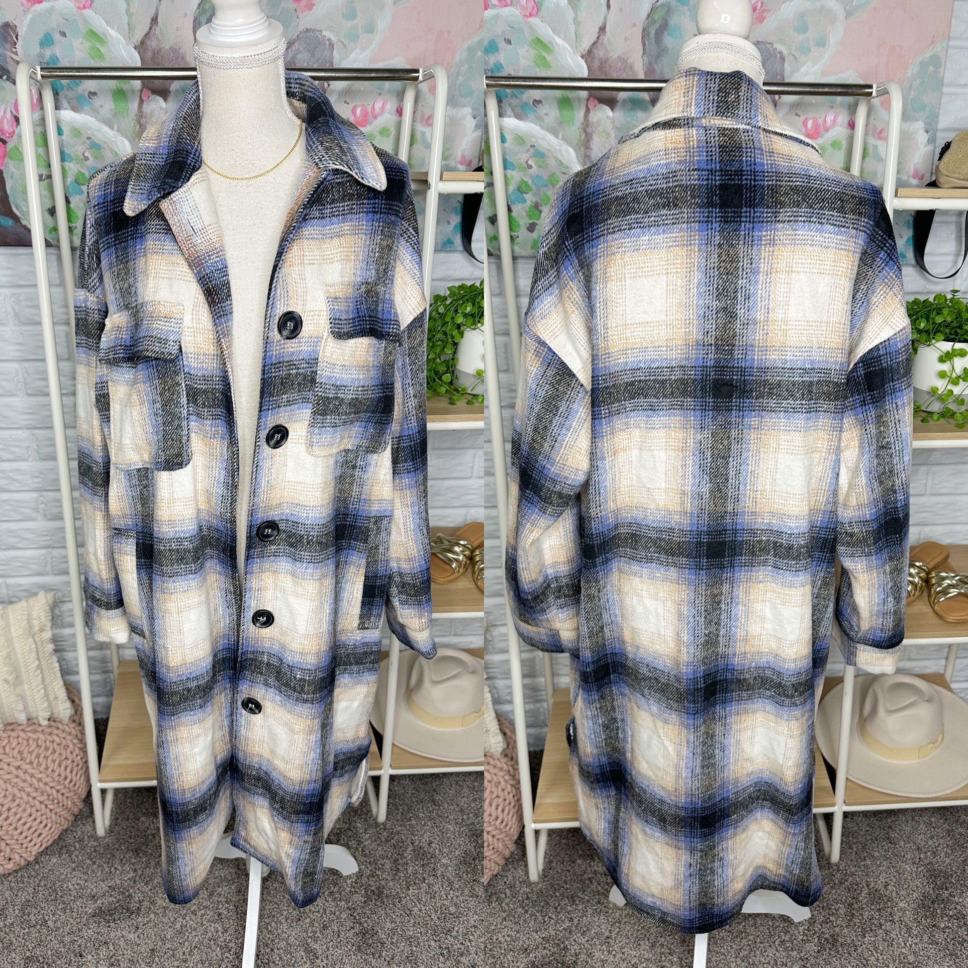 A blue, black, and cream plaid print coat with a button front and chest pockets.