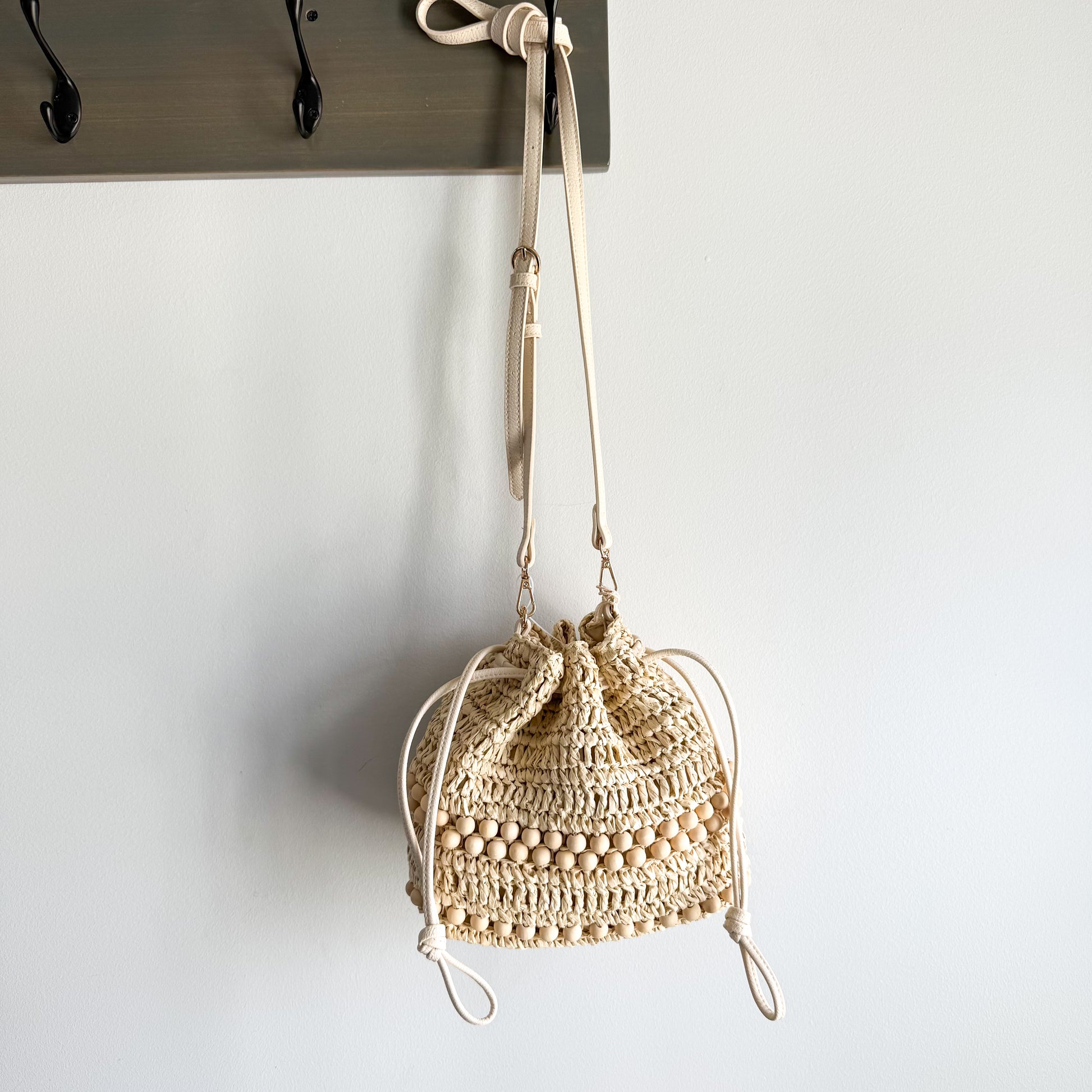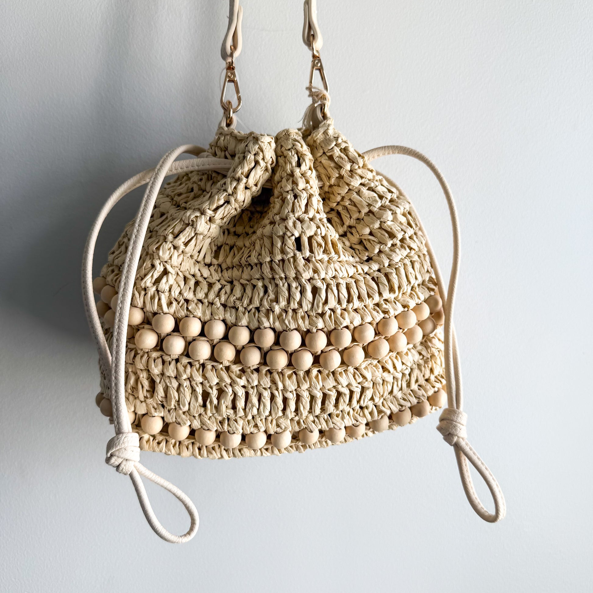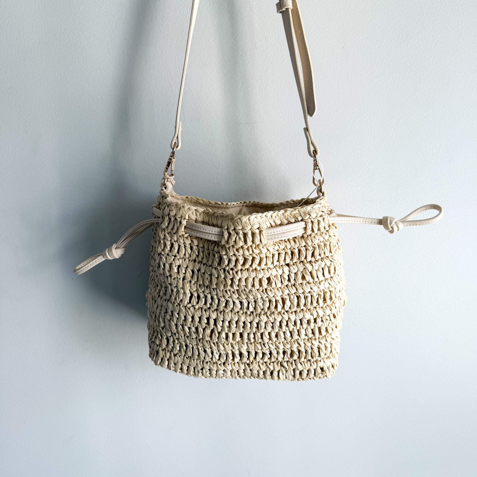 Elevate your style with this chic beige woven drawstring bag. Perfect for casual outings, this bag combines fashion and functionality. Sold out online.
