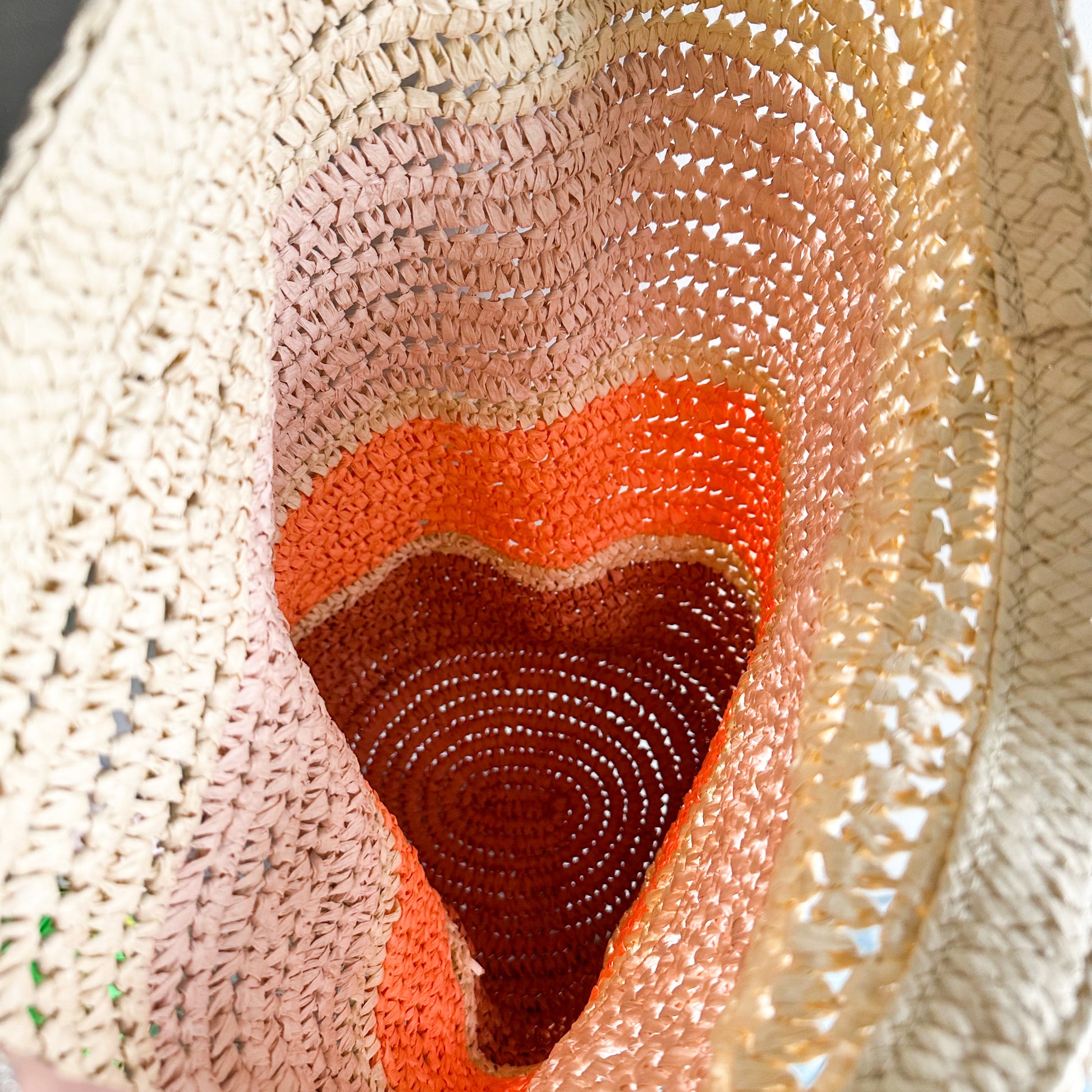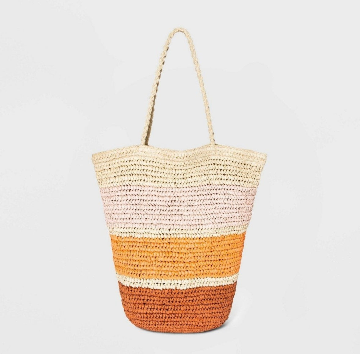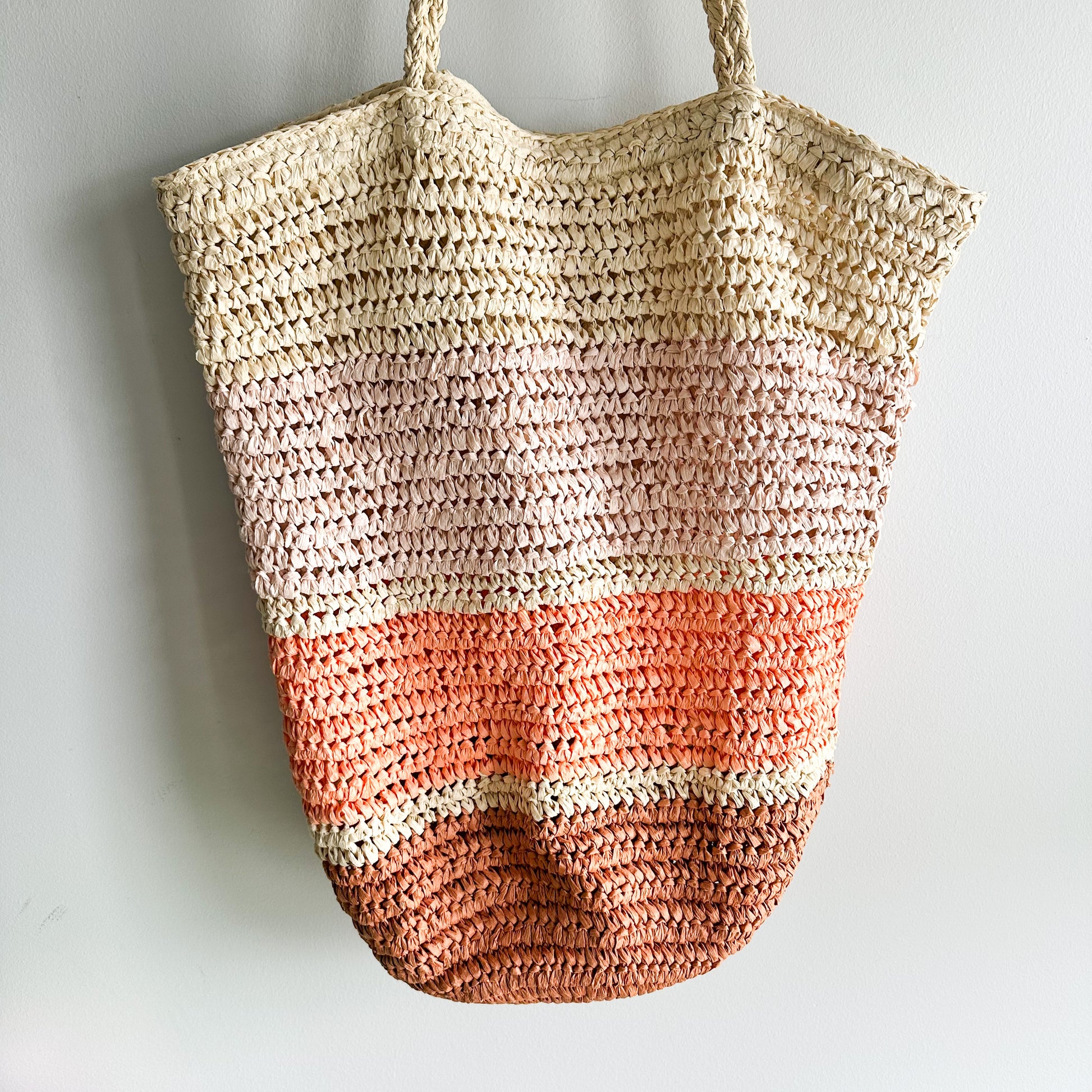 A large raffia tote bag with a multi color pattern of peach, tan, brown.