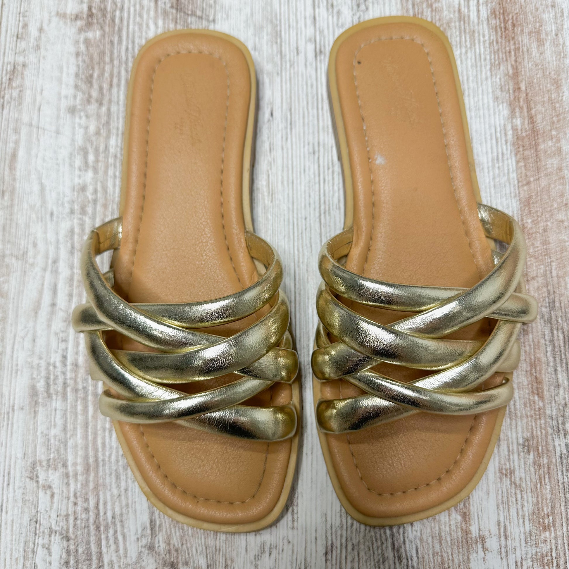 A gold metallic strappy sandal with an open toe.