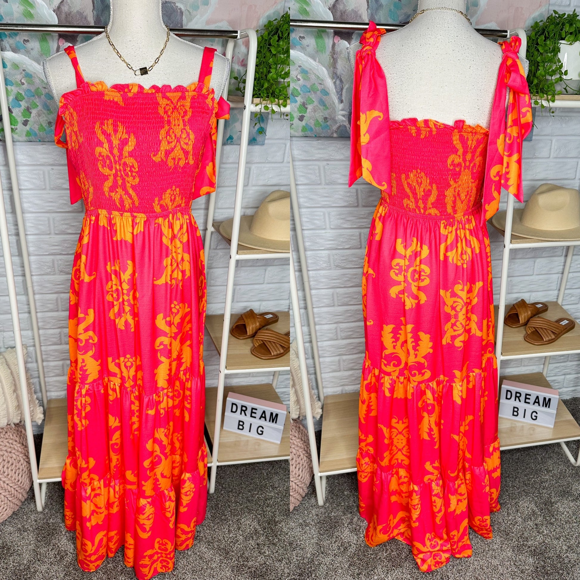 A bright pink & orange print summer maxi dress with adjustable tie straps and a smocked bust.
