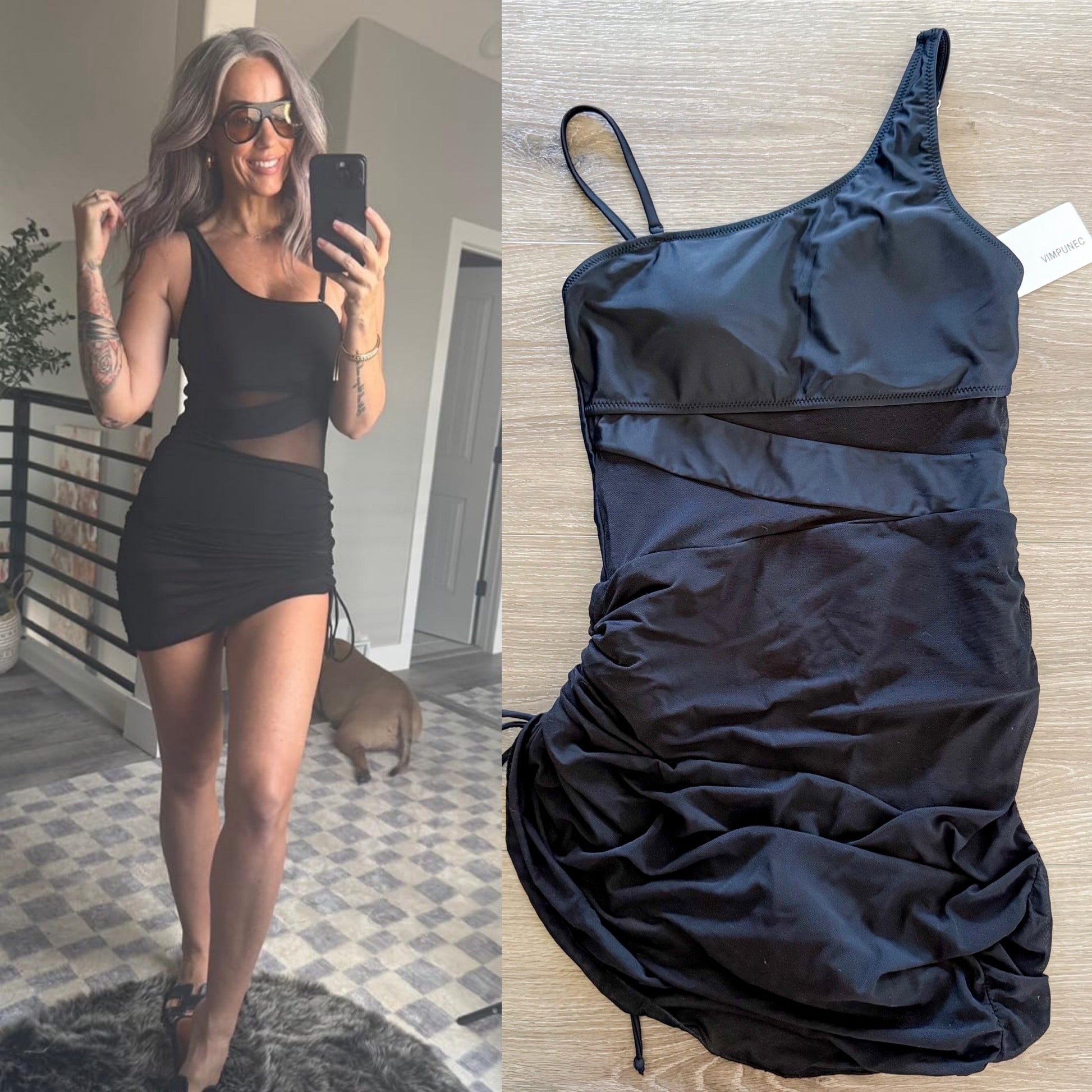 A black one piece swimsuit with mesh panels and a cinched side on the skirt.