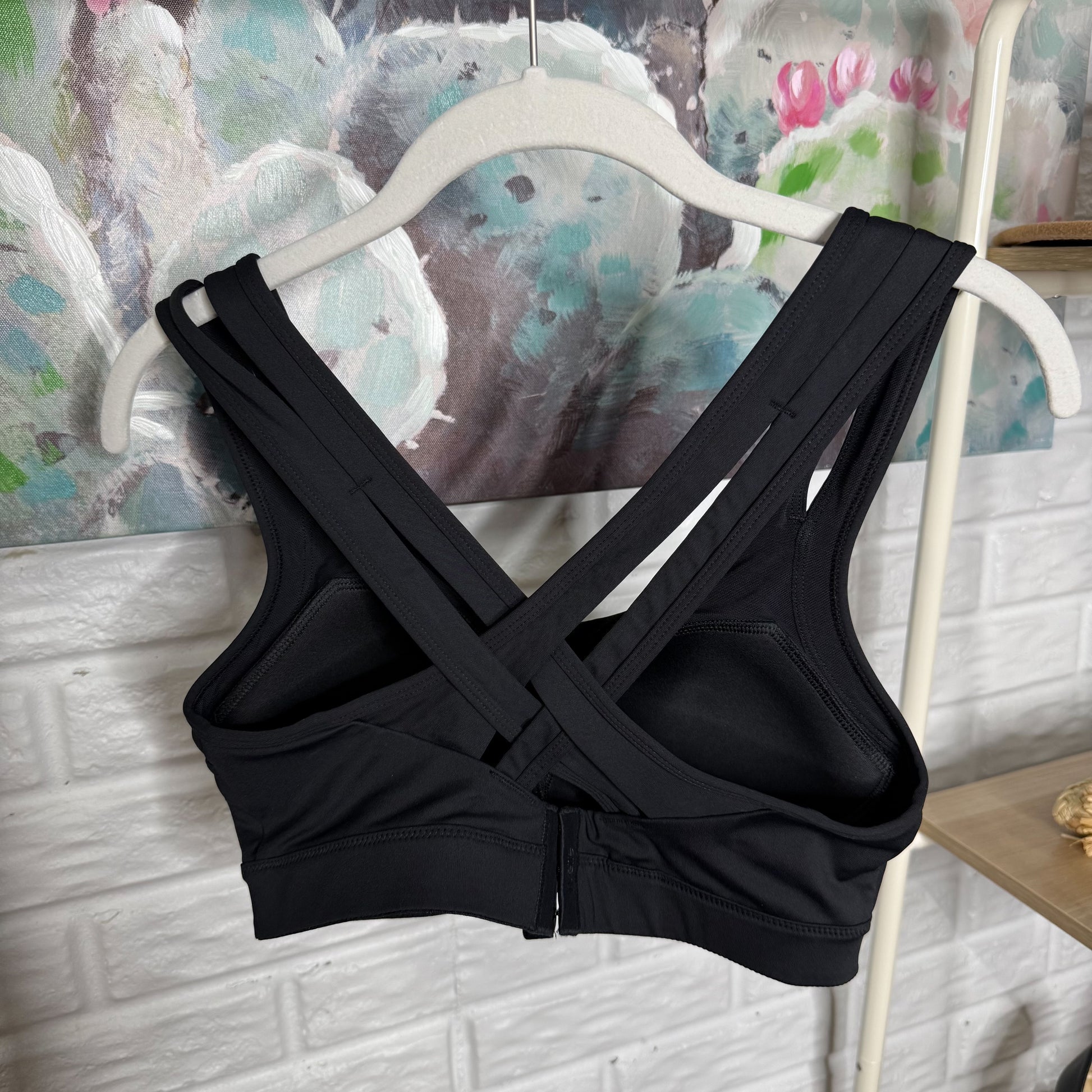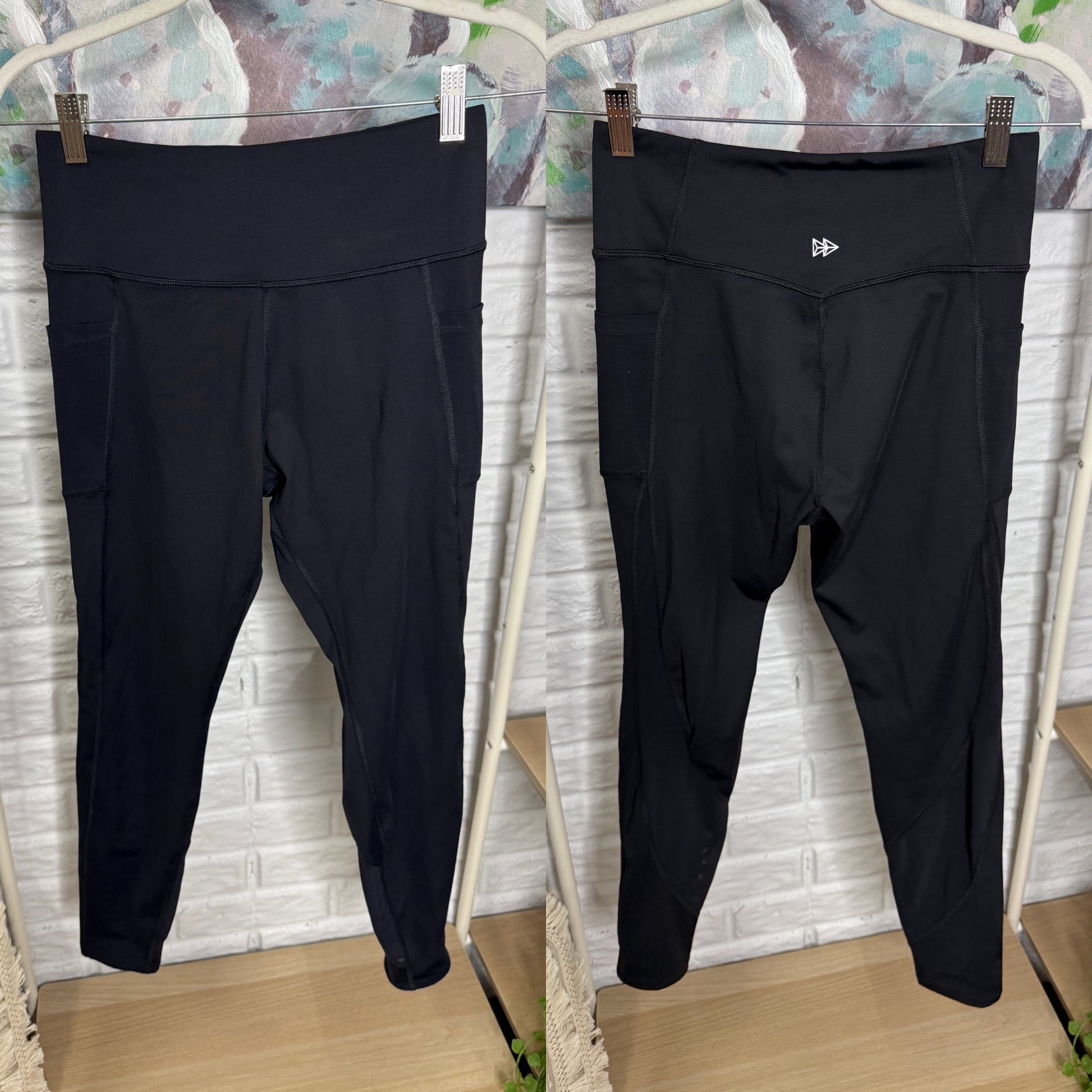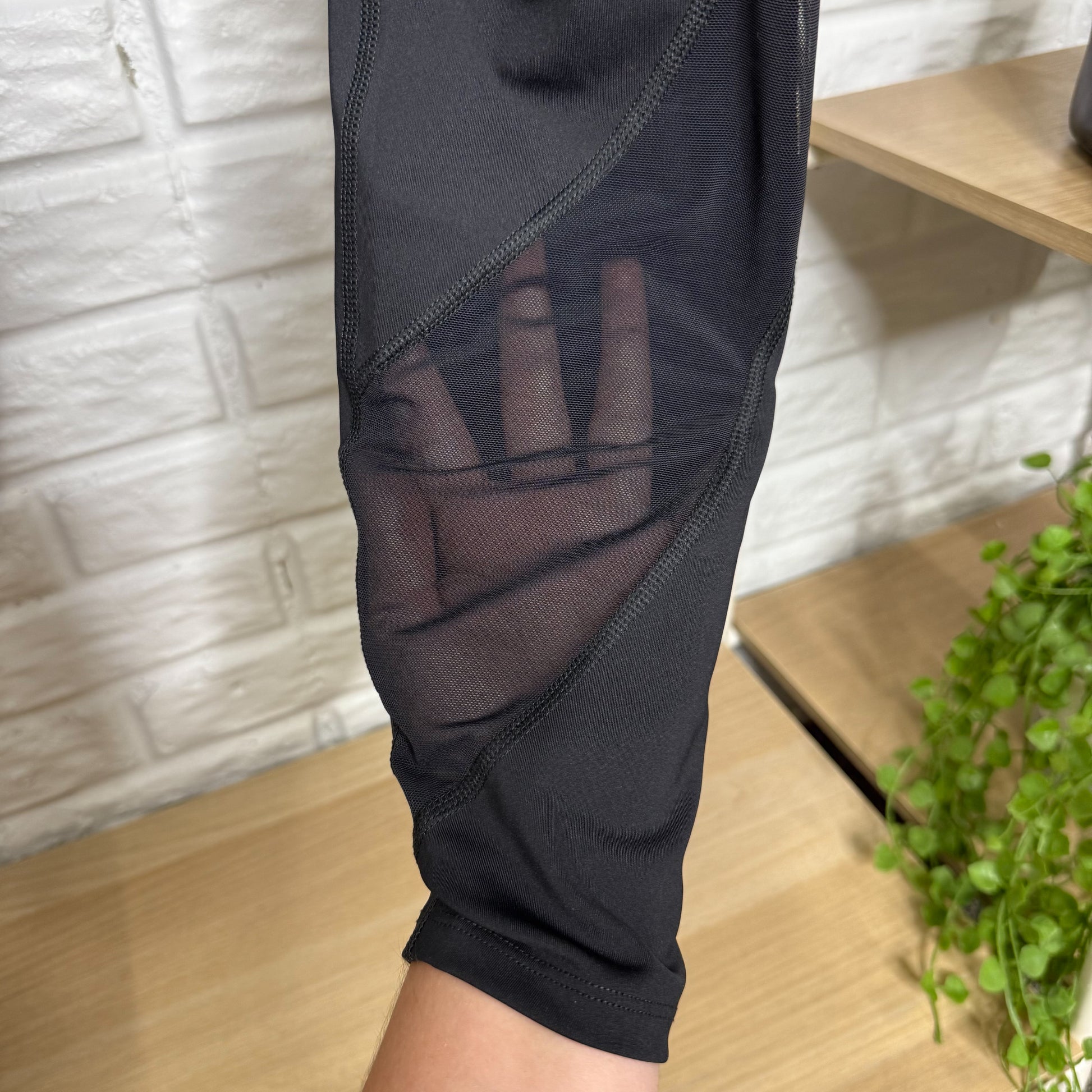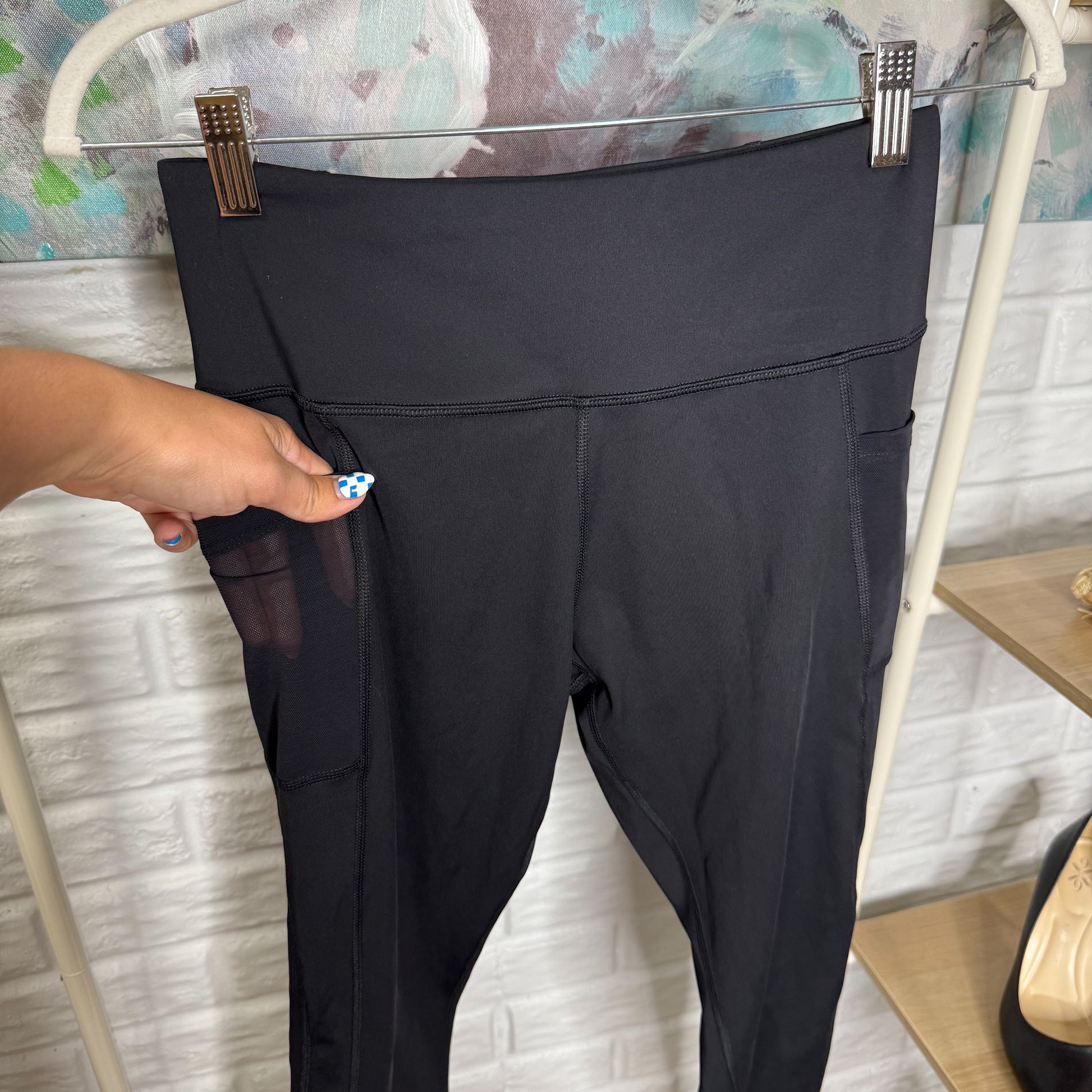A matching sports bra and legging set. Sleek black high-waisted leggings with a stylish mesh design on the legs. Criss cross back sports bra with hook band. Perfect for workouts or casual wear. Size medium bra and large legging.